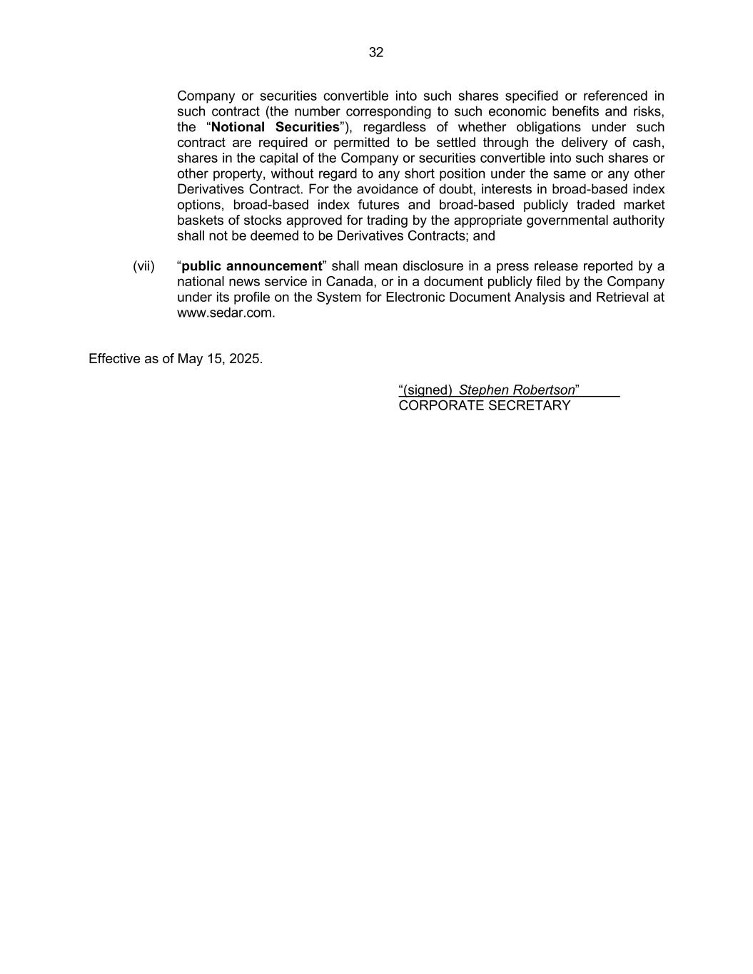 32 Company or securities convertible into such shares specified or referenced in such contract (the number corresponding to such economic benefits and risks, the “Notional Securities”), regardless of whether obligations under such contract are required or permitted to be settled through the delivery of cash, shares in the capital of the Company or securities convertible into such shares or other property, without regard to any short position under the same or any other Derivatives Contract. For the avoidance of doubt, interests in broad-based index options, broad-based index futures and broad-based publicly traded market baskets of stocks approved for trading by the appropriate governmental authority shall not be deemed to be Derivatives Contracts; and (vii) “public announcement” shall mean disclosure in a press release reported by a national news service in Canada, or in a document publicly filed by the Company under its profile on the System for Electronic Document Analysis and Retrieval at www.sedar.com. Effective as of May 15, 2025. “(signed) Stephen Robertson” CORPORATE SECRETARY
