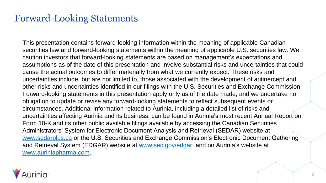 Forward-Looking Statements This presentation contains forward-looking information within the meaning of applicable Canadian securities law and forward-looking statements within the meaning of applicable U.S. securities law. We caution investors that forward-looking statements are based on management’s expectations and assumptions as of the date of this presentation and involve substantial risks and uncertainties that could cause the actual outcomes to differ materially from what we currently expect. These risks and uncertainties include, but are not limited to, those associated with the development of aritinercept and other risks and uncertainties identified in our filings with the U.S. Securities and Exchange Commission. Forward-looking statements in this presentation apply only as of the date made, and we undertake no obligation to update or revise any forward-looking statements to reflect subsequent events or circumstances. Additional information related to Aurinia, including a detailed list of risks and uncertainties affecting Aurinia and its business, can be found in Aurinia’s most recent Annual Report on Form 10-K and its other public available filings available by accessing the Canadian Securities Administrators’ System for Electronic Document Analysis and Retrieval (SEDAR) website at www.sedarplus.ca or the U.S. Securities and Exchange Commission’s Electronic Document Gathering and Retrieval System (EDGAR) website at www.sec.gov/edgar, and on Aurinia’s website at www.auriniapharma.com. 2