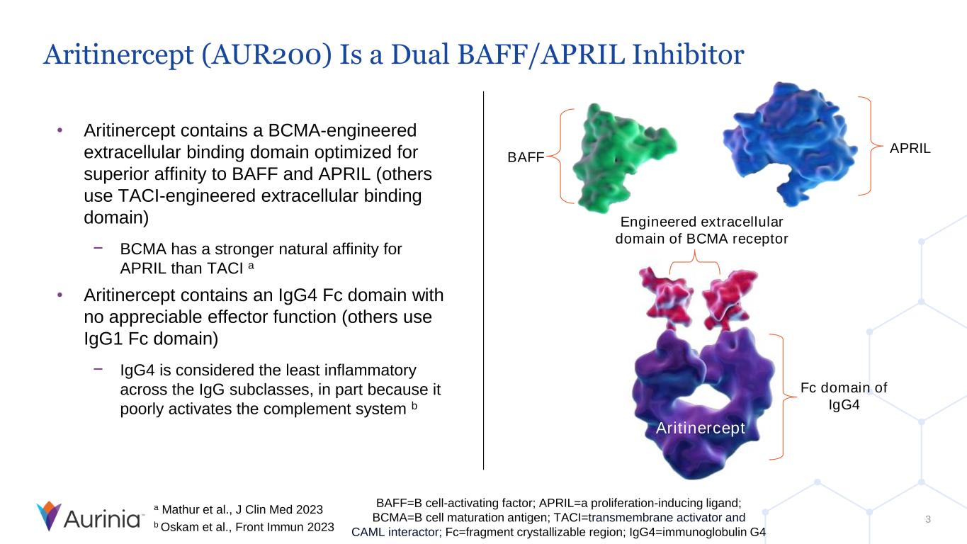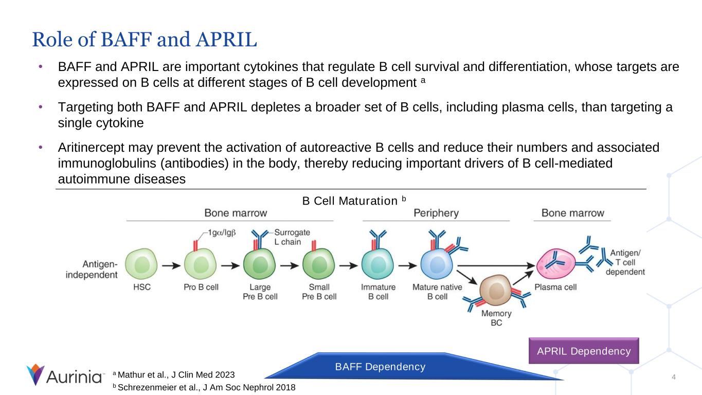 Aritinercept (AUR200) Is a Dual BAFF/APRIL Inhibitor • Aritinercept contains a BCMA-engineered extracellular binding domain optimized for superior affinity to BAFF and APRIL (others use TACI-engineered extracellular binding domain) − BCMA has a stronger natural affinity for APRIL than TACI a • Aritinercept contains an IgG4 Fc domain with no appreciable effector function (others use IgG1 Fc domain) − IgG4 is considered the least inflammatory across the IgG subclasses, in part because it poorly activates the complement system b Engineered extracellular domain of BCMA receptor AUR200 BAFF APRIL Fc domain of IgG4 Aritinercept BAFF=B cell-activating factor; APRIL=a proliferation-inducing ligand; BCMA=B cell maturation antigen; TACI=transmembrane activator and CAML interactor; Fc=fragment crystallizable region; IgG4=immunoglobulin G4 a Mathur et al., J Clin Med 2023 b Oskam et al., Front Immun 2023 3