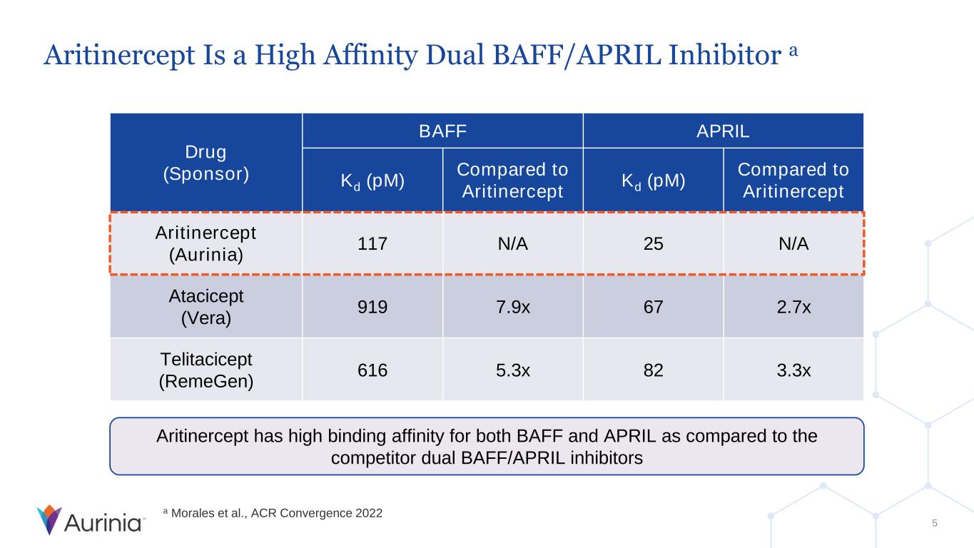 Aritinercept Is a High Affinity Dual BAFF/APRIL Inhibitor a Aritinercept has high binding affinity for both BAFF and APRIL as compared to the competitor dual BAFF/APRIL inhibitors Drug (Sponsor) BAFF APRIL Kd (pM) Compared to Aritinercept Kd (pM) Compared to Aritinercept Aritinercept (Aurinia) 117 N/A 25 N/A Atacicept (Vera) 919 7.9x 67 2.7x Telitacicept (RemeGen) 616 5.3x 82 3.3x a Morales et al., ACR Convergence 2022 5