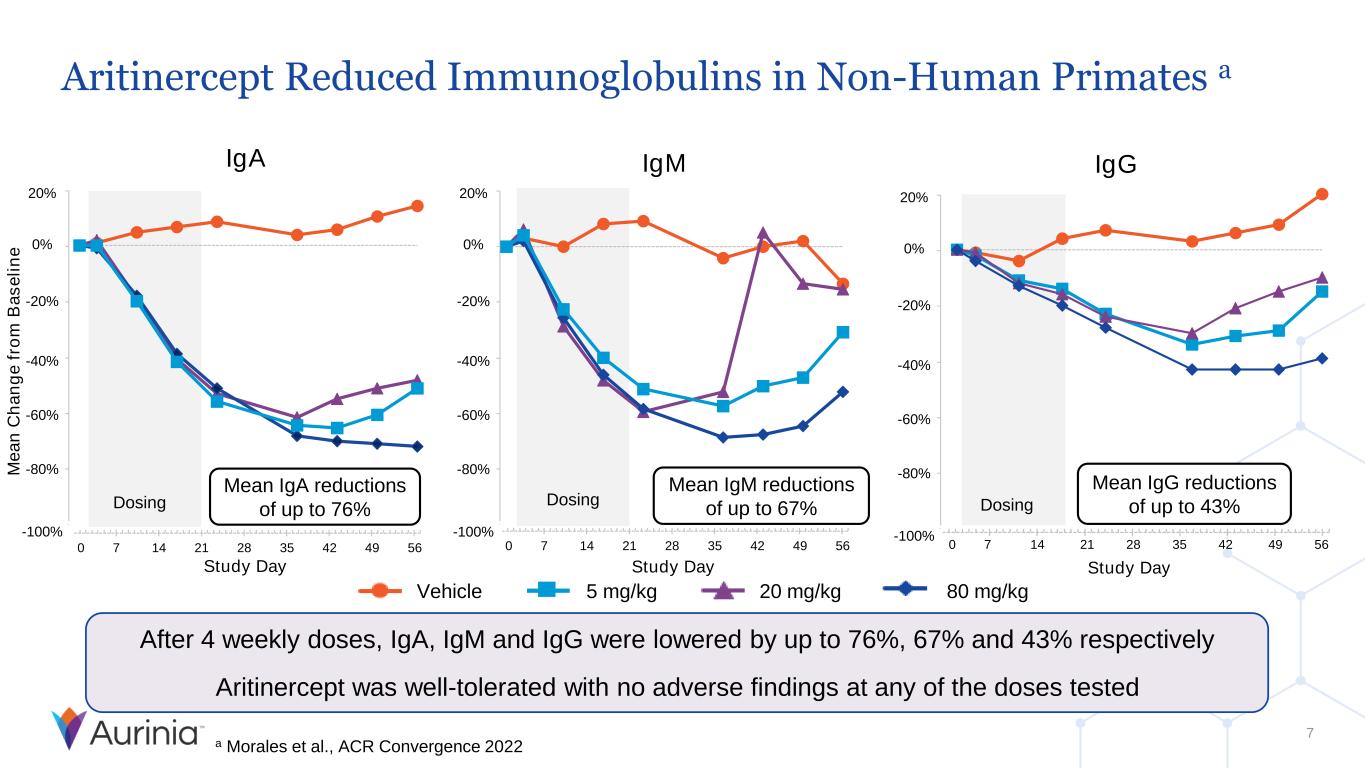 Aritinercept Potently Inhibits BAFF- and APRIL-Mediated B Cell Proliferation a Aritinercept potently inhibits both BAFF- and APRIL-mediated B cell proliferation as compared to the competitor dual BAFF/APRIL inhibitors Drug (Sponsor) BAFF APRIL IC50 (nM) Compared to Aritinercept IC50 (nM) Compared to Aritinercept Aritinercept (Aurinia) 0.02 N/A 0.37 N/A Atacicept (Vera) 0.38 19.0x 2.15 5.8x Telitacicept (RemeGen) 1.05 52.5x 4.14 11.2x a Morales et al., ACR Convergence 2022 Atacicept Telitacicept Atacicept Telitacicept R e la ti v e L u m in e s c e n c e U n it s ( R L U s ) R e la ti v e L u m in e s c e n c e U n it s ( R L U s ) B Cell Proliferation in the Presence of BAFF B Cell Proliferation in the Presence of APRIL 6 Aritinercept Aritinercept