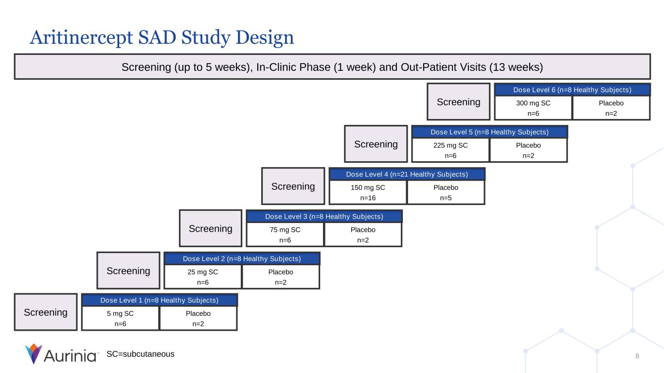 Vehicle 5 mg/kg 20 mg/kg 80 mg/kg Aritinercept Reduced Immunoglobulins in Non-Human Primates a After 4 weekly doses, IgA, IgM and IgG were lowered by up to 76%, 67% and 43% respectively Aritinercept was well-tolerated with no adverse findings at any of the doses tested a Morales et al., ACR Convergence 2022 7 Dosing Study Day Mean IgG reductions of up to 43% IgA IgM IgG 20% 0% -20% -40% -60% -80% -100% 0 7 14 21 28 35 42 49 56 0 7 14 21 28 35 42 49 56 20% 0% -20% -40% -60% -80% -100% DosingDosing 0 7 14 21 28 35 42 49 56 20% 0% -20% -40% -60% -80% -100% Study Day Mean IgA reductions of up to 76% M e a n C h a n g e f ro m B a s e li n e Mean IgM reductions of up to 67% Study Day