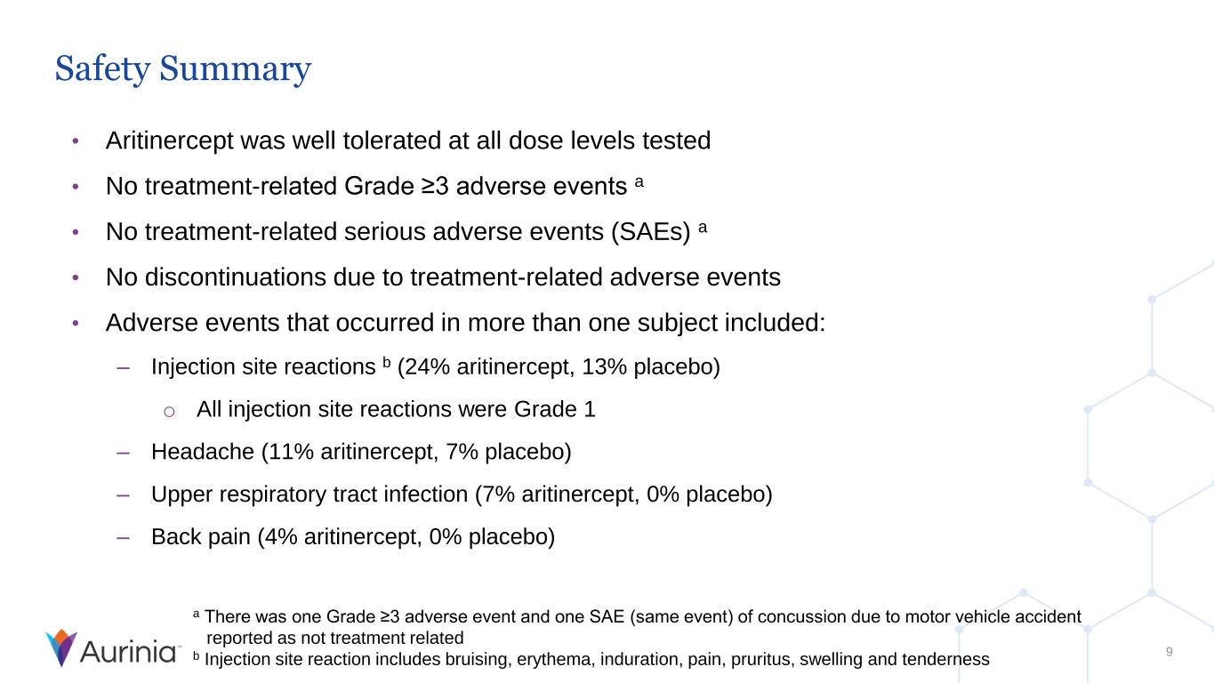 Aritinercept SAD Study Design Placebo n=2 5 mg SC n=6 Screening Dose Level 1 (n=8 Healthy Subjects) Screening (up to 5 weeks), In-Clinic Phase (1 week) and Out-Patient Visits (13 weeks) 8 Placebo n=2 25 mg SC n=6 Screening Dose Level 2 (n=8 Healthy Subjects) Placebo n=2 75 mg SC n=6 Screening Dose Level 3 (n=8 Healthy Subjects) Placebo n=5 150 mg SC n=16 Screening Dose Level 4 (n=21 Healthy Subjects) Placebo n=2 225 mg SC n=6 Screening Dose Level 5 (n=8 Healthy Subjects) Placebo n=2 300 mg SC n=6 Screening Dose Level 6 (n=8 Healthy Subjects) SC=subcutaneous