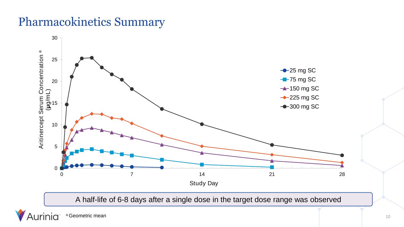 Safety Summary • Aritinercept was well tolerated at all dose levels tested • No treatment-related Grade ≥3 adverse events a • No treatment-related serious adverse events (SAEs) a • No discontinuations due to treatment-related adverse events • Adverse events that occurred in more than one subject included: – Injection site reactions b (24% aritinercept, 13% placebo) o All injection site reactions were Grade 1 – Headache (11% aritinercept, 7% placebo) – Upper respiratory tract infection (7% aritinercept, 0% placebo) – Back pain (4% aritinercept, 0% placebo) a There was one Grade ≥3 adverse event and one SAE (same event) of concussion due to motor vehicle accident reported as not treatment related b Injection site reaction includes bruising, erythema, induration, pain, pruritus, swelling and tenderness 9