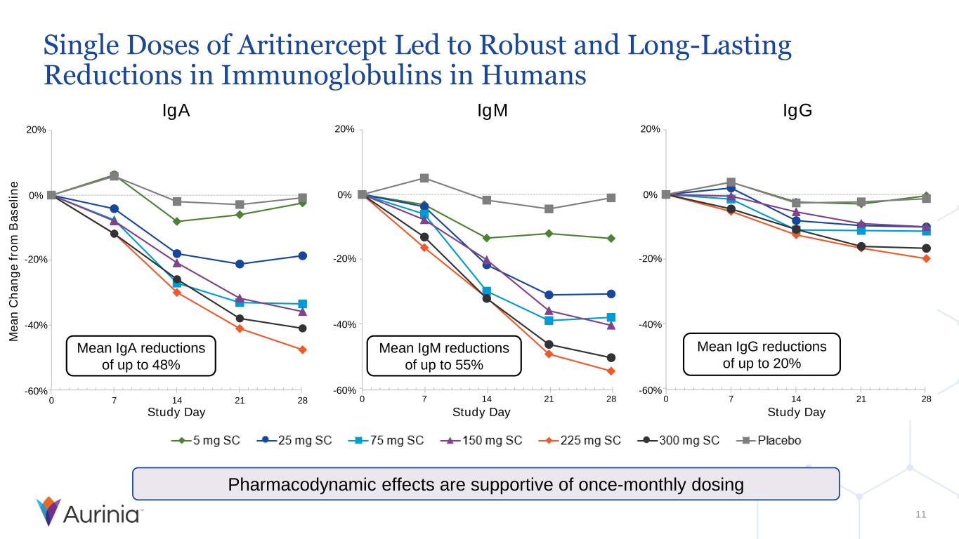0 7 14 21 28 Study Day 20% 0% -20% -40% -60% 20% 0% -20% -40% -60% 0 7 14 21 28 M e a n C h a n g e f ro m B a s e li n e Study Day 20% 0% -20% -40% -60% 0 7 14 21 28 Study Day Single Doses of Aritinercept Led to Robust and Long-Lasting Reductions in Immunoglobulins in Humans 11 Pharmacodynamic effects are supportive of once-monthly dosing IgA IgM IgG Mean IgA reductions of up to 48% Mean IgM reductions of up to 55% Mean IgG reductions of up to 20%