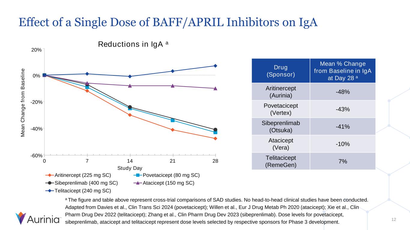 20% 0% -20% -40% -60% Effect of a Single Dose of BAFF/APRIL Inhibitors on IgA 12 a The figure and table above represent cross-trial comparisons of SAD studies. No head-to-head clinical studies have been conducted. Adapted from Davies et al., Clin Trans Sci 2024 (povetacicept); Willen et al., Eur J Drug Metab Ph 2020 (atacicept); Xie et al., Clin Pharm Drug Dev 2022 (telitacicept); Zhang et al., Clin Pharm Drug Dev 2023 (sibeprenlimab). Dose levels for povetacicept, sibeprenlimab, atacicept and telitacicept represent dose levels selected by respective sponsors for Phase 3 development. Reductions in IgA a Drug (Sponsor) Mean % Change from Baseline in IgA at Day 28 a Aritinercept (Aurinia) -48% Povetacicept (Vertex) -43% Sibeprenlimab (Otsuka) -41% Atacicept (Vera) -10% Telitacicept (RemeGen) 7%0 7 14 21 28 Study Day Aritinercept (225 mg SC) Povetacicept (80 mg SC) Sibeprenlimab (400 mg SC) Atacicept (150 mg SC) Telitacicept (240 mg SC) M e a n C h a n g e f ro m B a s e li n e