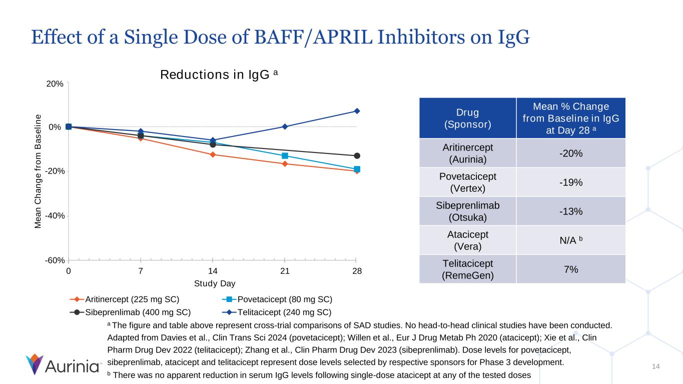 Effect of a Single Dose of BAFF/APRIL Inhibitors on IgM 13 Reductions in IgM a 0 7 14 21 28 Study Day Aritinercept (225 mg SC) Povetacicept (80 mg SC) Sibeprenlimab (400 mg SC) Atacicept (150 mg SC) Telitacicept (240 mg SC) 20% 0% -20% -40% -60% Drug (Sponsor) Mean % Change from Baseline in IgM at Day 28 a Aritinercept (Aurinia) -55% Povetacicept (Vertex) -52% Sibeprenlimab (Otsuka) -39% Atacicept (Vera) -17% Telitacicept (RemeGen) 6% a The figure and table above represent cross-trial comparisons of SAD studies. No head-to-head clinical studies have been conducted. Adapted from Davies et al., Clin Trans Sci 2024 (povetacicept); Willen et al., Eur J Drug Metab Ph 2020 (atacicept); Xie et al., Clin Pharm Drug Dev 2022 (telitacicept); Zhang et al., Clin Pharm Drug Dev 2023 (sibeprenlimab). Dose levels for povetacicept, sibeprenlimab, atacicept and telitacicept represent dose levels selected by respective sponsors for Phase 3 development. M e a n C h a n g e f ro m B a s e li n e