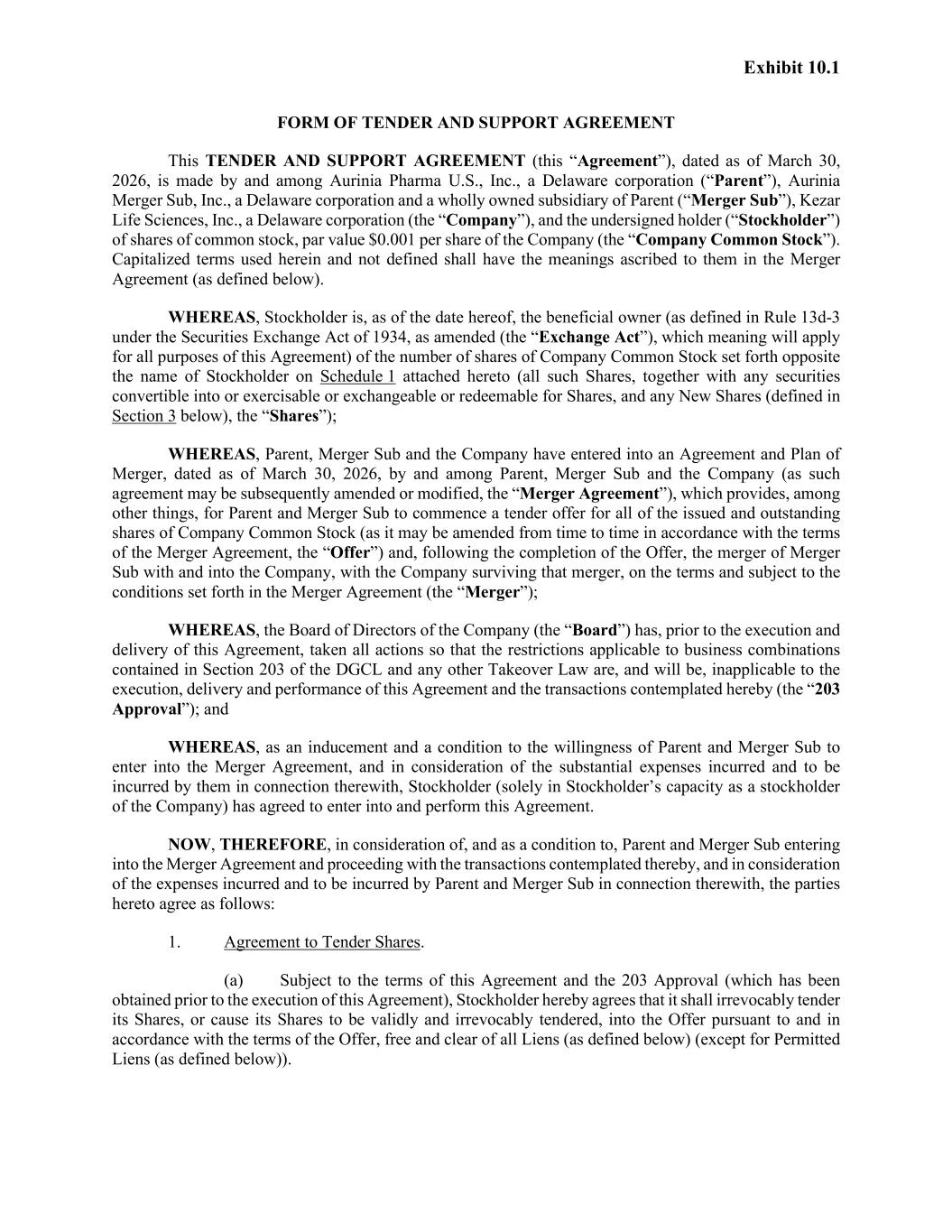 Exhibit 10.1 FORM OF TENDER AND SUPPORT AGREEMENT This TENDER AND SUPPORT AGREEMENT (this “Agreement”), dated as of March 30, 2026, is made by and among Aurinia Pharma U.S., Inc., a Delaware corporation (“Parent”), Aurinia Merger Sub, Inc., a Delaware corporation and a wholly owned subsidiary of Parent (“Merger Sub”), Kezar Life Sciences, Inc., a Delaware corporation (the “Company”), and the undersigned holder (“Stockholder”) of shares of common stock, par value $0.001 per share of the Company (the “Company Common Stock”). Capitalized terms used herein and not defined shall have the meanings ascribed to them in the Merger Agreement (as defined below). WHEREAS, Stockholder is, as of the date hereof, the beneficial owner (as defined in Rule 13d-3 under the Securities Exchange Act of 1934, as amended (the “Exchange Act”), which meaning will apply for all purposes of this Agreement) of the number of shares of Company Common Stock set forth opposite the name of Stockholder on Schedule 1 attached hereto (all such Shares, together with any securities convertible into or exercisable or exchangeable or redeemable for Shares, and any New Shares (defined in Section 3 below), the “Shares”); WHEREAS, Parent, Merger Sub and the Company have entered into an Agreement and Plan of Merger, dated as of March 30, 2026, by and among Parent, Merger Sub and the Company (as such agreement may be subsequently amended or modified, the “Merger Agreement”), which provides, among other things, for Parent and Merger Sub to commence a tender offer for all of the issued and outstanding shares of Company Common Stock (as it may be amended from time to time in accordance with the terms of the Merger Agreement, the “Offer”) and, following the completion of the Offer, the merger of Merger Sub with and into the Company, with the Company surviving that merger, on the terms and subject to the conditions set forth in the Merger Agreement (the “Merger”); WHEREAS, the Board of Directors of the Company (the “Board”) has, prior to the execution and delivery of this Agreement, taken all actions so that the restrictions applicable to business combinations contained in Section 203 of the DGCL and any other Takeover Law are, and will be, inapplicable to the execution, delivery and performance of this Agreement and the transactions contemplated hereby (the “203 Approval”); and WHEREAS, as an inducement and a condition to the willingness of Parent and Merger Sub to enter into the Merger Agreement, and in consideration of the substantial expenses incurred and to be incurred by them in connection therewith, Stockholder (solely in Stockholder’s capacity as a stockholder of the Company) has agreed to enter into and perform this Agreement. NOW, THEREFORE, in consideration of, and as a condition to, Parent and Merger Sub entering into the Merger Agreement and proceeding with the transactions contemplated thereby, and in consideration of the expenses incurred and to be incurred by Parent and Merger Sub in connection therewith, the parties hereto agree as follows: 1. Agreement to Tender Shares. (a) Subject to the terms of this Agreement and the 203 Approval (which has been obtained prior to the execution of this Agreement), Stockholder hereby agrees that it shall irrevocably tender its Shares, or cause its Shares to be validly and irrevocably tendered, into the Offer pursuant to and in accordance with the terms of the Offer, free and clear of all Liens (as defined below) (except for Permitted Liens (as defined below)).