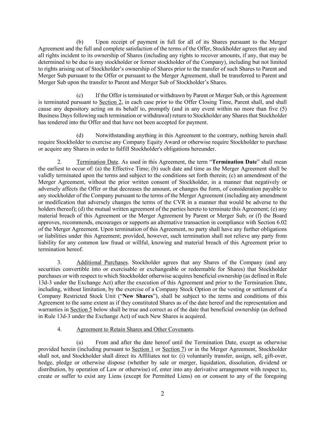 2 (b) Upon receipt of payment in full for all of its Shares pursuant to the Merger Agreement and the full and complete satisfaction of the terms of the Offer, Stockholder agrees that any and all rights incident to its ownership of Shares (including any rights to recover amounts, if any, that may be determined to be due to any stockholder or former stockholder of the Company), including but not limited to rights arising out of Stockholder’s ownership of Shares prior to the transfer of such Shares to Parent and Merger Sub pursuant to the Offer or pursuant to the Merger Agreement, shall be transferred to Parent and Merger Sub upon the transfer to Parent and Merger Sub of Stockholder’s Shares. (c) If the Offer is terminated or withdrawn by Parent or Merger Sub, or this Agreement is terminated pursuant to Section 2, in each case prior to the Offer Closing Time, Parent shall, and shall cause any depository acting on its behalf to, promptly (and in any event within no more than five (5) Business Days following such termination or withdrawal) return to Stockholder any Shares that Stockholder has tendered into the Offer and that have not been accepted for payment. (d) Notwithstanding anything in this Agreement to the contrary, nothing herein shall require Stockholder to exercise any Company Equity Award or otherwise require Stockholder to purchase or acquire any Shares in order to fulfill Stockholder's obligations hereunder. 2. Termination Date. As used in this Agreement, the term “Termination Date” shall mean the earliest to occur of: (a) the Effective Time; (b) such date and time as the Merger Agreement shall be validly terminated upon the terms and subject to the conditions set forth therein; (c) an amendment of the Merger Agreement, without the prior written consent of Stockholder, in a manner that negatively or adversely affects the Offer or that decreases the amount, or changes the form, of consideration payable to any stockholder of the Company pursuant to the terms of the Merger Agreement (including any amendment or modification that adversely changes the terms of the CVR in a manner that would be adverse to the holders thereof); (d) the mutual written agreement of the parties hereto to terminate this Agreement; (e) any material breach of this Agreement or the Merger Agreement by Parent or Merger Sub; or (f) the Board approves, recommends, encourages or supports an alternative transaction in compliance with Section 6.02 of the Merger Agreement. Upon termination of this Agreement, no party shall have any further obligations or liabilities under this Agreement; provided, however, such termination shall not relieve any party from liability for any common law fraud or willful, knowing and material breach of this Agreement prior to termination hereof. 3. Additional Purchases. Stockholder agrees that any Shares of the Company (and any securities convertible into or exercisable or exchangeable or redeemable for Shares) that Stockholder purchases or with respect to which Stockholder otherwise acquires beneficial ownership (as defined in Rule 13d-3 under the Exchange Act) after the execution of this Agreement and prior to the Termination Date, including, without limitation, by the exercise of a Company Stock Option or the vesting or settlement of a Company Restricted Stock Unit (“New Shares”), shall be subject to the terms and conditions of this Agreement to the same extent as if they constituted Shares as of the date hereof and the representation and warranties in Section 5 below shall be true and correct as of the date that beneficial ownership (as defined in Rule 13d-3 under the Exchange Act) of such New Shares is acquired. 4. Agreement to Retain Shares and Other Covenants. (a) From and after the date hereof until the Termination Date, except as otherwise provided herein (including pursuant to Section 1 or Section 7) or in the Merger Agreement, Stockholder shall not, and Stockholder shall direct its Affiliates not to: (i) voluntarily transfer, assign, sell, gift-over, hedge, pledge or otherwise dispose (whether by sale or merger, liquidation, dissolution, dividend or distribution, by operation of Law or otherwise) of, enter into any derivative arrangement with respect to, create or suffer to exist any Liens (except for Permitted Liens) on or consent to any of the foregoing