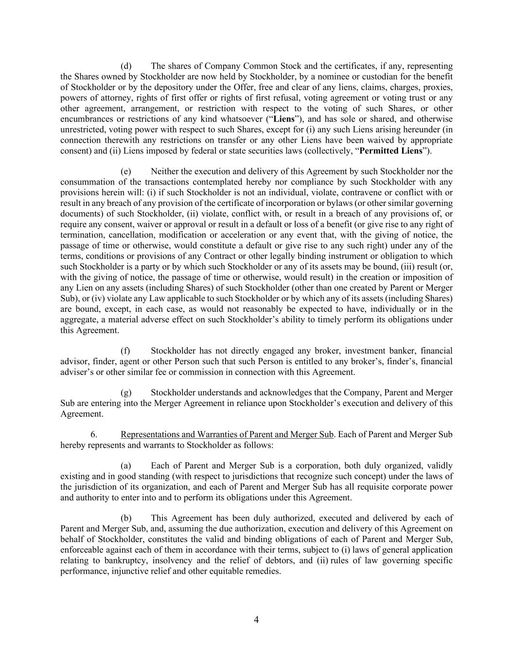 4 (d) The shares of Company Common Stock and the certificates, if any, representing the Shares owned by Stockholder are now held by Stockholder, by a nominee or custodian for the benefit of Stockholder or by the depository under the Offer, free and clear of any liens, claims, charges, proxies, powers of attorney, rights of first offer or rights of first refusal, voting agreement or voting trust or any other agreement, arrangement, or restriction with respect to the voting of such Shares, or other encumbrances or restrictions of any kind whatsoever (“Liens”), and has sole or shared, and otherwise unrestricted, voting power with respect to such Shares, except for (i) any such Liens arising hereunder (in connection therewith any restrictions on transfer or any other Liens have been waived by appropriate consent) and (ii) Liens imposed by federal or state securities laws (collectively, “Permitted Liens”). (e) Neither the execution and delivery of this Agreement by such Stockholder nor the consummation of the transactions contemplated hereby nor compliance by such Stockholder with any provisions herein will: (i) if such Stockholder is not an individual, violate, contravene or conflict with or result in any breach of any provision of the certificate of incorporation or bylaws (or other similar governing documents) of such Stockholder, (ii) violate, conflict with, or result in a breach of any provisions of, or require any consent, waiver or approval or result in a default or loss of a benefit (or give rise to any right of termination, cancellation, modification or acceleration or any event that, with the giving of notice, the passage of time or otherwise, would constitute a default or give rise to any such right) under any of the terms, conditions or provisions of any Contract or other legally binding instrument or obligation to which such Stockholder is a party or by which such Stockholder or any of its assets may be bound, (iii) result (or, with the giving of notice, the passage of time or otherwise, would result) in the creation or imposition of any Lien on any assets (including Shares) of such Stockholder (other than one created by Parent or Merger Sub), or (iv) violate any Law applicable to such Stockholder or by which any of its assets (including Shares) are bound, except, in each case, as would not reasonably be expected to have, individually or in the aggregate, a material adverse effect on such Stockholder’s ability to timely perform its obligations under this Agreement. (f) Stockholder has not directly engaged any broker, investment banker, financial advisor, finder, agent or other Person such that such Person is entitled to any broker’s, finder’s, financial adviser’s or other similar fee or commission in connection with this Agreement. (g) Stockholder understands and acknowledges that the Company, Parent and Merger Sub are entering into the Merger Agreement in reliance upon Stockholder’s execution and delivery of this Agreement. 6. Representations and Warranties of Parent and Merger Sub. Each of Parent and Merger Sub hereby represents and warrants to Stockholder as follows: (a) Each of Parent and Merger Sub is a corporation, both duly organized, validly existing and in good standing (with respect to jurisdictions that recognize such concept) under the laws of the jurisdiction of its organization, and each of Parent and Merger Sub has all requisite corporate power and authority to enter into and to perform its obligations under this Agreement. (b) This Agreement has been duly authorized, executed and delivered by each of Parent and Merger Sub, and, assuming the due authorization, execution and delivery of this Agreement on behalf of Stockholder, constitutes the valid and binding obligations of each of Parent and Merger Sub, enforceable against each of them in accordance with their terms, subject to (i) laws of general application relating to bankruptcy, insolvency and the relief of debtors, and (ii) rules of law governing specific performance, injunctive relief and other equitable remedies.