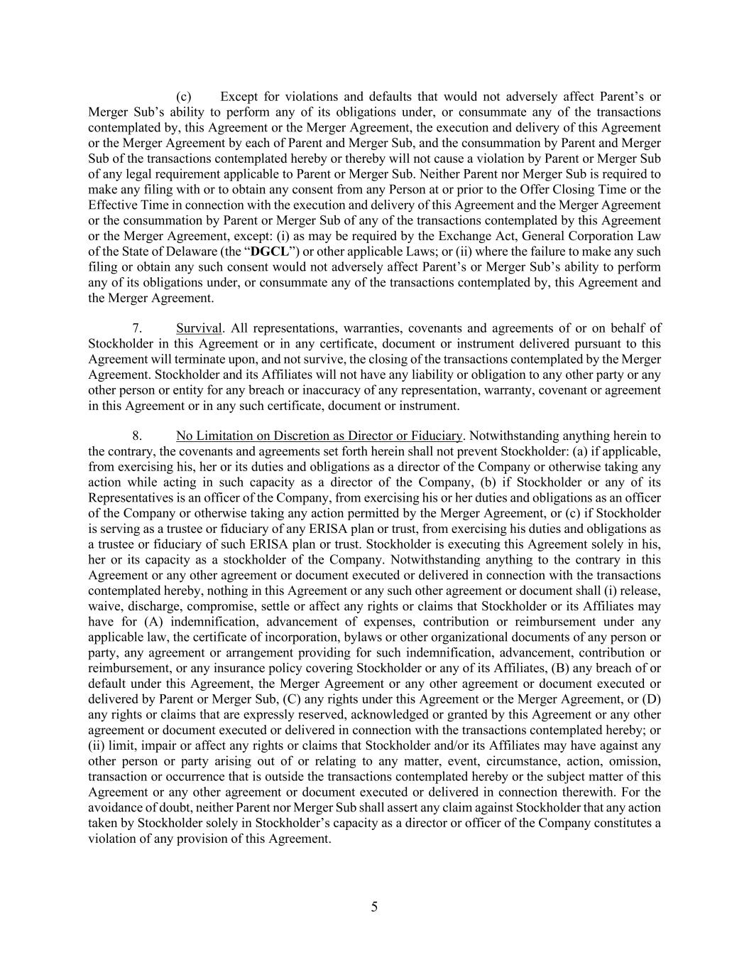 5 (c) Except for violations and defaults that would not adversely affect Parent’s or Merger Sub’s ability to perform any of its obligations under, or consummate any of the transactions contemplated by, this Agreement or the Merger Agreement, the execution and delivery of this Agreement or the Merger Agreement by each of Parent and Merger Sub, and the consummation by Parent and Merger Sub of the transactions contemplated hereby or thereby will not cause a violation by Parent or Merger Sub of any legal requirement applicable to Parent or Merger Sub. Neither Parent nor Merger Sub is required to make any filing with or to obtain any consent from any Person at or prior to the Offer Closing Time or the Effective Time in connection with the execution and delivery of this Agreement and the Merger Agreement or the consummation by Parent or Merger Sub of any of the transactions contemplated by this Agreement or the Merger Agreement, except: (i) as may be required by the Exchange Act, General Corporation Law of the State of Delaware (the “DGCL”) or other applicable Laws; or (ii) where the failure to make any such filing or obtain any such consent would not adversely affect Parent’s or Merger Sub’s ability to perform any of its obligations under, or consummate any of the transactions contemplated by, this Agreement and the Merger Agreement. 7. Survival. All representations, warranties, covenants and agreements of or on behalf of Stockholder in this Agreement or in any certificate, document or instrument delivered pursuant to this Agreement will terminate upon, and not survive, the closing of the transactions contemplated by the Merger Agreement. Stockholder and its Affiliates will not have any liability or obligation to any other party or any other person or entity for any breach or inaccuracy of any representation, warranty, covenant or agreement in this Agreement or in any such certificate, document or instrument. 8. No Limitation on Discretion as Director or Fiduciary. Notwithstanding anything herein to the contrary, the covenants and agreements set forth herein shall not prevent Stockholder: (a) if applicable, from exercising his, her or its duties and obligations as a director of the Company or otherwise taking any action while acting in such capacity as a director of the Company, (b) if Stockholder or any of its Representatives is an officer of the Company, from exercising his or her duties and obligations as an officer of the Company or otherwise taking any action permitted by the Merger Agreement, or (c) if Stockholder is serving as a trustee or fiduciary of any ERISA plan or trust, from exercising his duties and obligations as a trustee or fiduciary of such ERISA plan or trust. Stockholder is executing this Agreement solely in his, her or its capacity as a stockholder of the Company. Notwithstanding anything to the contrary in this Agreement or any other agreement or document executed or delivered in connection with the transactions contemplated hereby, nothing in this Agreement or any such other agreement or document shall (i) release, waive, discharge, compromise, settle or affect any rights or claims that Stockholder or its Affiliates may have for (A) indemnification, advancement of expenses, contribution or reimbursement under any applicable law, the certificate of incorporation, bylaws or other organizational documents of any person or party, any agreement or arrangement providing for such indemnification, advancement, contribution or reimbursement, or any insurance policy covering Stockholder or any of its Affiliates, (B) any breach of or default under this Agreement, the Merger Agreement or any other agreement or document executed or delivered by Parent or Merger Sub, (C) any rights under this Agreement or the Merger Agreement, or (D) any rights or claims that are expressly reserved, acknowledged or granted by this Agreement or any other agreement or document executed or delivered in connection with the transactions contemplated hereby; or (ii) limit, impair or affect any rights or claims that Stockholder and/or its Affiliates may have against any other person or party arising out of or relating to any matter, event, circumstance, action, omission, transaction or occurrence that is outside the transactions contemplated hereby or the subject matter of this Agreement or any other agreement or document executed or delivered in connection therewith. For the avoidance of doubt, neither Parent nor Merger Sub shall assert any claim against Stockholder that any action taken by Stockholder solely in Stockholder’s capacity as a director or officer of the Company constitutes a violation of any provision of this Agreement.