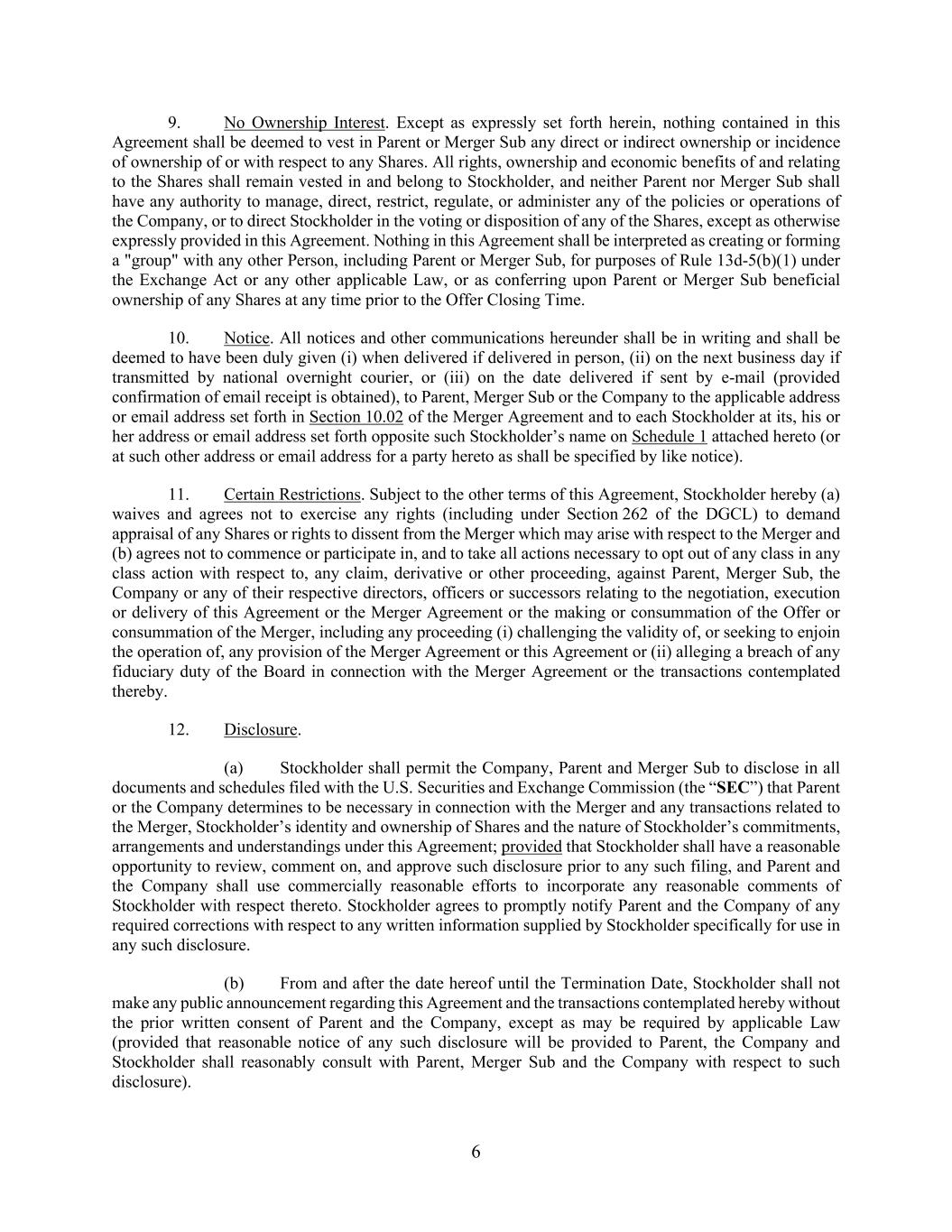 6 9. No Ownership Interest. Except as expressly set forth herein, nothing contained in this Agreement shall be deemed to vest in Parent or Merger Sub any direct or indirect ownership or incidence of ownership of or with respect to any Shares. All rights, ownership and economic benefits of and relating to the Shares shall remain vested in and belong to Stockholder, and neither Parent nor Merger Sub shall have any authority to manage, direct, restrict, regulate, or administer any of the policies or operations of the Company, or to direct Stockholder in the voting or disposition of any of the Shares, except as otherwise expressly provided in this Agreement. Nothing in this Agreement shall be interpreted as creating or forming a "group" with any other Person, including Parent or Merger Sub, for purposes of Rule 13d-5(b)(1) under the Exchange Act or any other applicable Law, or as conferring upon Parent or Merger Sub beneficial ownership of any Shares at any time prior to the Offer Closing Time. 10. Notice. All notices and other communications hereunder shall be in writing and shall be deemed to have been duly given (i) when delivered if delivered in person, (ii) on the next business day if transmitted by national overnight courier, or (iii) on the date delivered if sent by e-mail (provided confirmation of email receipt is obtained), to Parent, Merger Sub or the Company to the applicable address or email address set forth in Section 10.02 of the Merger Agreement and to each Stockholder at its, his or her address or email address set forth opposite such Stockholder’s name on Schedule 1 attached hereto (or at such other address or email address for a party hereto as shall be specified by like notice). 11. Certain Restrictions. Subject to the other terms of this Agreement, Stockholder hereby (a) waives and agrees not to exercise any rights (including under Section 262 of the DGCL) to demand appraisal of any Shares or rights to dissent from the Merger which may arise with respect to the Merger and (b) agrees not to commence or participate in, and to take all actions necessary to opt out of any class in any class action with respect to, any claim, derivative or other proceeding, against Parent, Merger Sub, the Company or any of their respective directors, officers or successors relating to the negotiation, execution or delivery of this Agreement or the Merger Agreement or the making or consummation of the Offer or consummation of the Merger, including any proceeding (i) challenging the validity of, or seeking to enjoin the operation of, any provision of the Merger Agreement or this Agreement or (ii) alleging a breach of any fiduciary duty of the Board in connection with the Merger Agreement or the transactions contemplated thereby. 12. Disclosure. (a) Stockholder shall permit the Company, Parent and Merger Sub to disclose in all documents and schedules filed with the U.S. Securities and Exchange Commission (the “SEC”) that Parent or the Company determines to be necessary in connection with the Merger and any transactions related to the Merger, Stockholder’s identity and ownership of Shares and the nature of Stockholder’s commitments, arrangements and understandings under this Agreement; provided that Stockholder shall have a reasonable opportunity to review, comment on, and approve such disclosure prior to any such filing, and Parent and the Company shall use commercially reasonable efforts to incorporate any reasonable comments of Stockholder with respect thereto. Stockholder agrees to promptly notify Parent and the Company of any required corrections with respect to any written information supplied by Stockholder specifically for use in any such disclosure. (b) From and after the date hereof until the Termination Date, Stockholder shall not make any public announcement regarding this Agreement and the transactions contemplated hereby without the prior written consent of Parent and the Company, except as may be required by applicable Law (provided that reasonable notice of any such disclosure will be provided to Parent, the Company and Stockholder shall reasonably consult with Parent, Merger Sub and the Company with respect to such disclosure).