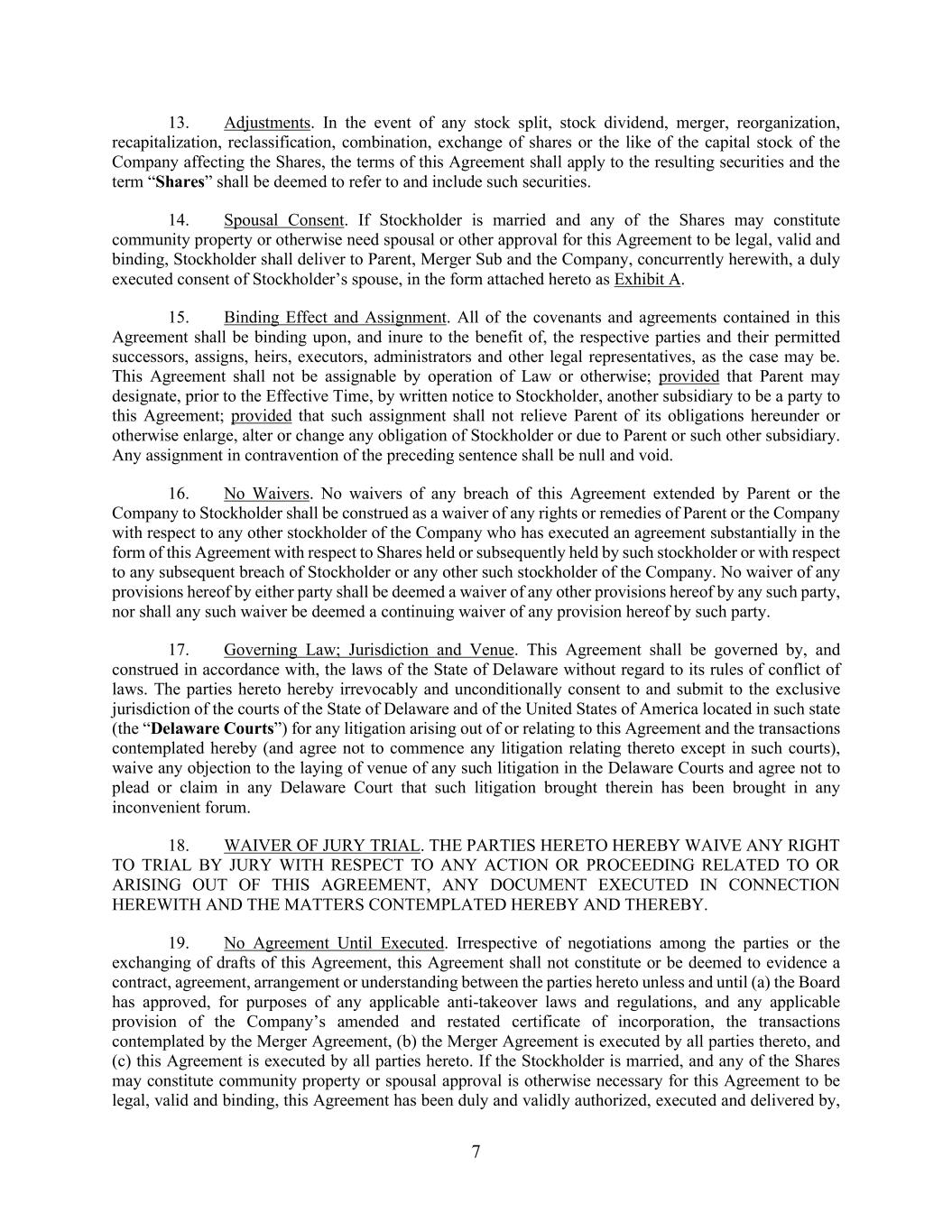 7 13. Adjustments. In the event of any stock split, stock dividend, merger, reorganization, recapitalization, reclassification, combination, exchange of shares or the like of the capital stock of the Company affecting the Shares, the terms of this Agreement shall apply to the resulting securities and the term “Shares” shall be deemed to refer to and include such securities. 14. Spousal Consent. If Stockholder is married and any of the Shares may constitute community property or otherwise need spousal or other approval for this Agreement to be legal, valid and binding, Stockholder shall deliver to Parent, Merger Sub and the Company, concurrently herewith, a duly executed consent of Stockholder’s spouse, in the form attached hereto as Exhibit A. 15. Binding Effect and Assignment. All of the covenants and agreements contained in this Agreement shall be binding upon, and inure to the benefit of, the respective parties and their permitted successors, assigns, heirs, executors, administrators and other legal representatives, as the case may be. This Agreement shall not be assignable by operation of Law or otherwise; provided that Parent may designate, prior to the Effective Time, by written notice to Stockholder, another subsidiary to be a party to this Agreement; provided that such assignment shall not relieve Parent of its obligations hereunder or otherwise enlarge, alter or change any obligation of Stockholder or due to Parent or such other subsidiary. Any assignment in contravention of the preceding sentence shall be null and void. 16. No Waivers. No waivers of any breach of this Agreement extended by Parent or the Company to Stockholder shall be construed as a waiver of any rights or remedies of Parent or the Company with respect to any other stockholder of the Company who has executed an agreement substantially in the form of this Agreement with respect to Shares held or subsequently held by such stockholder or with respect to any subsequent breach of Stockholder or any other such stockholder of the Company. No waiver of any provisions hereof by either party shall be deemed a waiver of any other provisions hereof by any such party, nor shall any such waiver be deemed a continuing waiver of any provision hereof by such party. 17. Governing Law; Jurisdiction and Venue. This Agreement shall be governed by, and construed in accordance with, the laws of the State of Delaware without regard to its rules of conflict of laws. The parties hereto hereby irrevocably and unconditionally consent to and submit to the exclusive jurisdiction of the courts of the State of Delaware and of the United States of America located in such state (the “Delaware Courts”) for any litigation arising out of or relating to this Agreement and the transactions contemplated hereby (and agree not to commence any litigation relating thereto except in such courts), waive any objection to the laying of venue of any such litigation in the Delaware Courts and agree not to plead or claim in any Delaware Court that such litigation brought therein has been brought in any inconvenient forum. 18. WAIVER OF JURY TRIAL. THE PARTIES HERETO HEREBY WAIVE ANY RIGHT TO TRIAL BY JURY WITH RESPECT TO ANY ACTION OR PROCEEDING RELATED TO OR ARISING OUT OF THIS AGREEMENT, ANY DOCUMENT EXECUTED IN CONNECTION HEREWITH AND THE MATTERS CONTEMPLATED HEREBY AND THEREBY. 19. No Agreement Until Executed. Irrespective of negotiations among the parties or the exchanging of drafts of this Agreement, this Agreement shall not constitute or be deemed to evidence a contract, agreement, arrangement or understanding between the parties hereto unless and until (a) the Board has approved, for purposes of any applicable anti-takeover laws and regulations, and any applicable provision of the Company’s amended and restated certificate of incorporation, the transactions contemplated by the Merger Agreement, (b) the Merger Agreement is executed by all parties thereto, and (c) this Agreement is executed by all parties hereto. If the Stockholder is married, and any of the Shares may constitute community property or spousal approval is otherwise necessary for this Agreement to be legal, valid and binding, this Agreement has been duly and validly authorized, executed and delivered by,