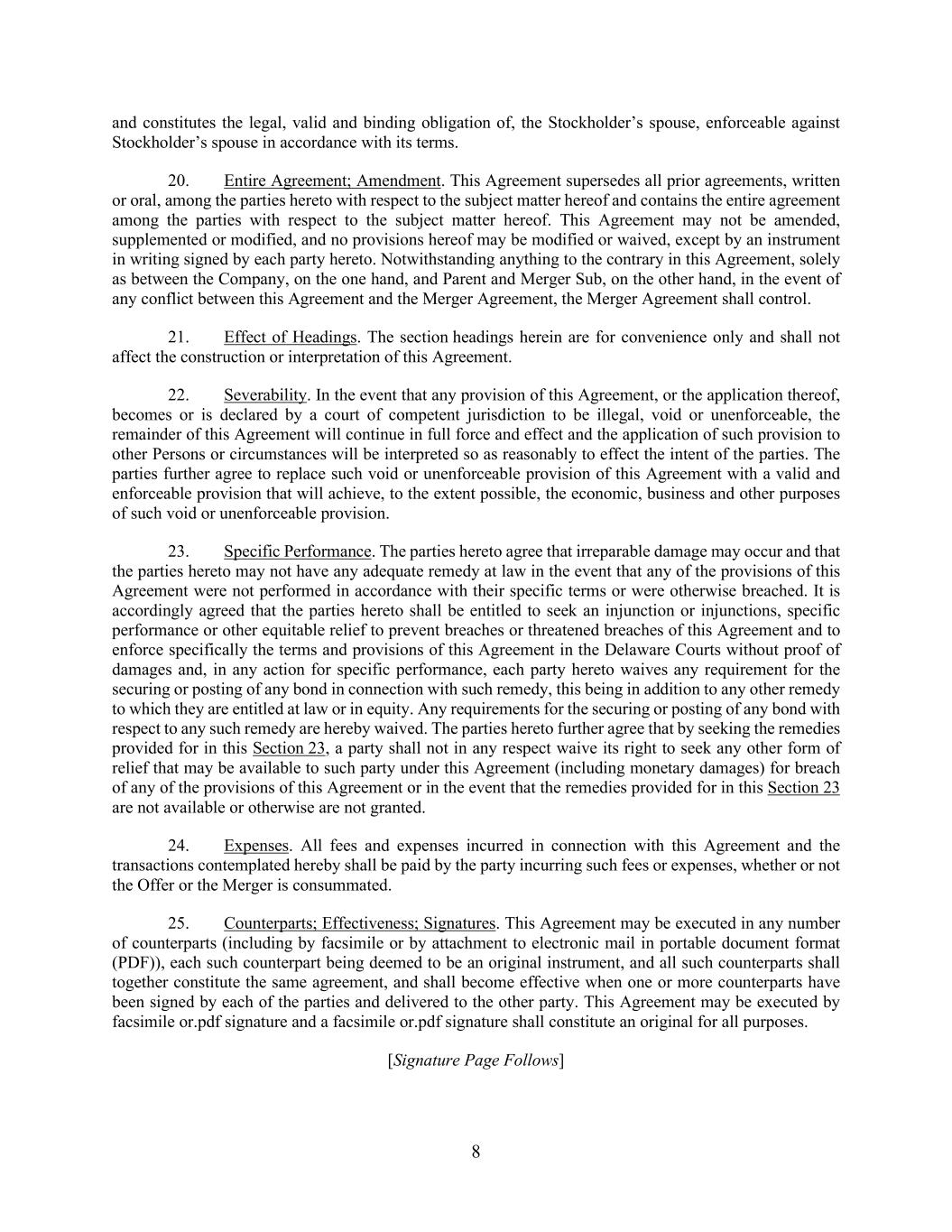 8 and constitutes the legal, valid and binding obligation of, the Stockholder’s spouse, enforceable against Stockholder’s spouse in accordance with its terms. 20. Entire Agreement; Amendment. This Agreement supersedes all prior agreements, written or oral, among the parties hereto with respect to the subject matter hereof and contains the entire agreement among the parties with respect to the subject matter hereof. This Agreement may not be amended, supplemented or modified, and no provisions hereof may be modified or waived, except by an instrument in writing signed by each party hereto. Notwithstanding anything to the contrary in this Agreement, solely as between the Company, on the one hand, and Parent and Merger Sub, on the other hand, in the event of any conflict between this Agreement and the Merger Agreement, the Merger Agreement shall control. 21. Effect of Headings. The section headings herein are for convenience only and shall not affect the construction or interpretation of this Agreement. 22. Severability. In the event that any provision of this Agreement, or the application thereof, becomes or is declared by a court of competent jurisdiction to be illegal, void or unenforceable, the remainder of this Agreement will continue in full force and effect and the application of such provision to other Persons or circumstances will be interpreted so as reasonably to effect the intent of the parties. The parties further agree to replace such void or unenforceable provision of this Agreement with a valid and enforceable provision that will achieve, to the extent possible, the economic, business and other purposes of such void or unenforceable provision. 23. Specific Performance. The parties hereto agree that irreparable damage may occur and that the parties hereto may not have any adequate remedy at law in the event that any of the provisions of this Agreement were not performed in accordance with their specific terms or were otherwise breached. It is accordingly agreed that the parties hereto shall be entitled to seek an injunction or injunctions, specific performance or other equitable relief to prevent breaches or threatened breaches of this Agreement and to enforce specifically the terms and provisions of this Agreement in the Delaware Courts without proof of damages and, in any action for specific performance, each party hereto waives any requirement for the securing or posting of any bond in connection with such remedy, this being in addition to any other remedy to which they are entitled at law or in equity. Any requirements for the securing or posting of any bond with respect to any such remedy are hereby waived. The parties hereto further agree that by seeking the remedies provided for in this Section 23, a party shall not in any respect waive its right to seek any other form of relief that may be available to such party under this Agreement (including monetary damages) for breach of any of the provisions of this Agreement or in the event that the remedies provided for in this Section 23 are not available or otherwise are not granted. 24. Expenses. All fees and expenses incurred in connection with this Agreement and the transactions contemplated hereby shall be paid by the party incurring such fees or expenses, whether or not the Offer or the Merger is consummated. 25. Counterparts; Effectiveness; Signatures. This Agreement may be executed in any number of counterparts (including by facsimile or by attachment to electronic mail in portable document format (PDF)), each such counterpart being deemed to be an original instrument, and all such counterparts shall together constitute the same agreement, and shall become effective when one or more counterparts have been signed by each of the parties and delivered to the other party. This Agreement may be executed by facsimile or.pdf signature and a facsimile or.pdf signature shall constitute an original for all purposes. [Signature Page Follows]