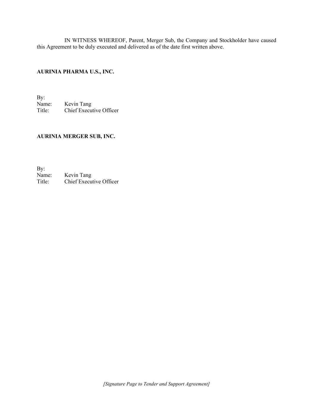 [Signature Page to Tender and Support Agreement] IN WITNESS WHEREOF, Parent, Merger Sub, the Company and Stockholder have caused this Agreement to be duly executed and delivered as of the date first written above. AURINIA PHARMA U.S., INC. By: Name: Kevin Tang Title: Chief Executive Officer AURINIA MERGER SUB, INC. By: Name: Kevin Tang Title: Chief Executive Officer