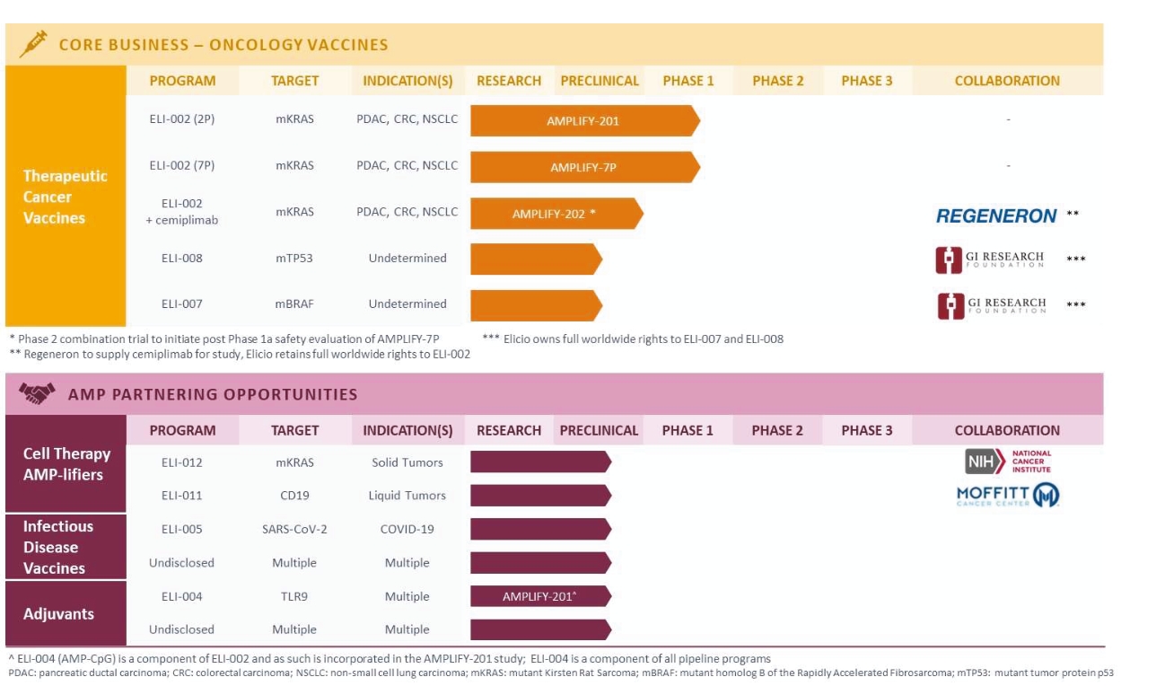 Elicio intends to advance additional applications of the AMP platform via out-licensing, co-development, or other partnership arrangements. These other applications include immune cell therapy AMP-lifiers for both CAR T cell therapeutics (e.g., ELI-011 for hematological cancers) and TCR T cell therapeutics (e.g., ELI-012 for mKRAS-driven solid tumors). Elicio has also completed preclinical proof-of-concept assessments related to the intranasal and subcutaneous use of the AMP platform to prevent infectious diseases, including COVID-19. Finally, Elicio is advancing a pipeline of multiple ‘next-generation’ AMP adjuvants that can be applied with external vaccines, therapeutic or prophylactic, including its lead adjuvant ELI-004, a component of ELI-002.