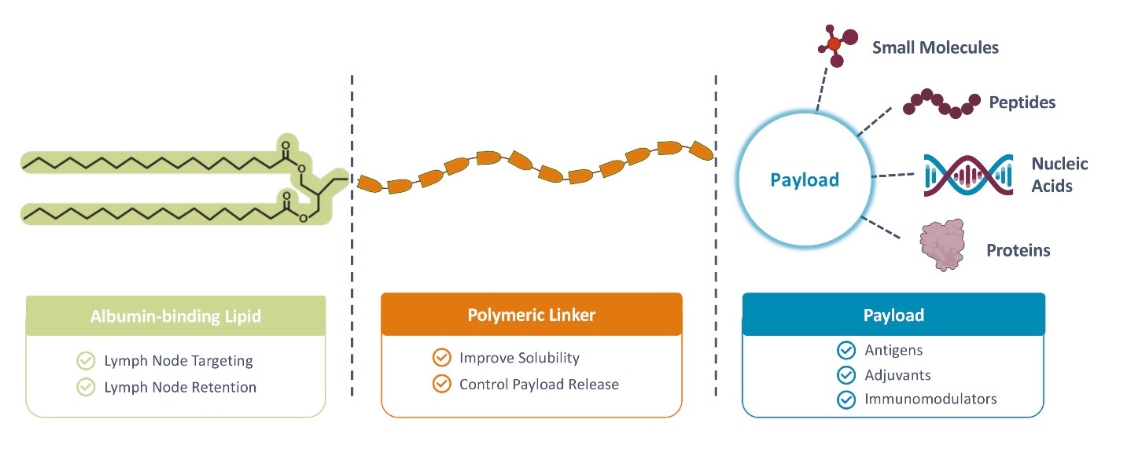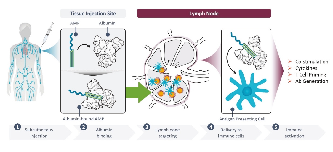 Elicio believes the improved delivery to the lymph nodes inherent with larger molecules holds great promise for enhanced immunological responses and therapeutic efficacy. Elicio’s AMP platform is designed to use this ability of larger molecules to deliver therapeutic payloads of interest to the lymphatic system.