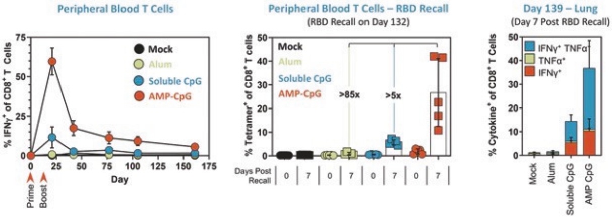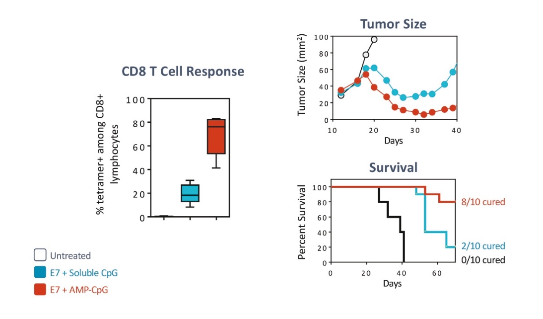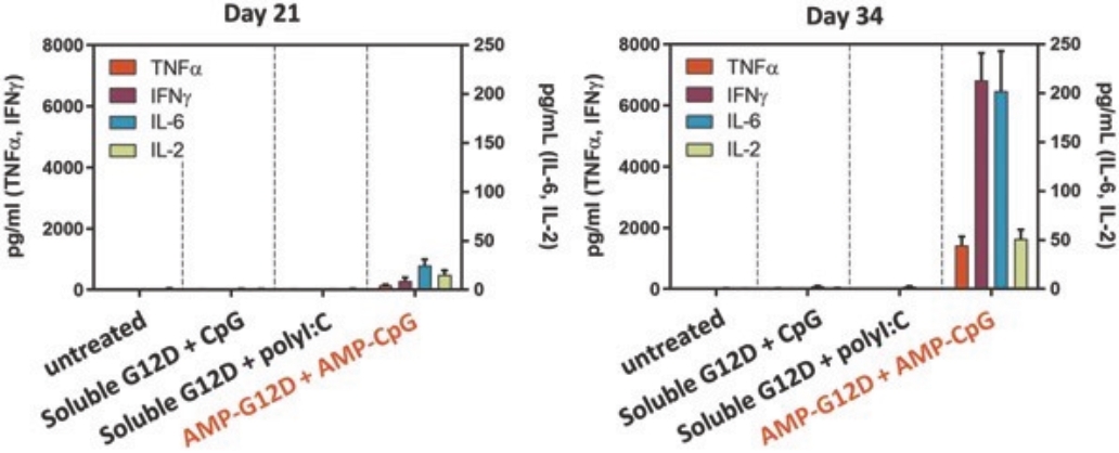 These data suggest not only does the AMP platform produce more T cells, but these T cells have improved functionality. The AMP-modified peptide/adjuvant combination’s ability to stimulate a strong immune response was demonstrated in additional studies evaluating the increase in cytokine levels generated by T cells induced with AMP-modified G12D peptides. Mice were administered the AMP construct four times at two-week intervals, with cytokine levels measured at intervening periods. These cytokine levels were compared against levels detected in T cells collected from untreated animals and after the administration of soluble peptide vaccines containing either soluble CpG or poly I:C adjuvant. As presented in the figure below, the AMP-modified peptides given with AMP-CpG generated increases in cytokine production from antigen stimulated T cells compared to either the untreated animals or animals treated with soluble peptide and adjuvant, with increased cytokine activity most pronounced after administration of both prime and boosting doses. Elicio believes this increase in cytokine activity is representative of the potency of an AMP-generated immune response and predictive of improvement to both T cell numbers and quality.