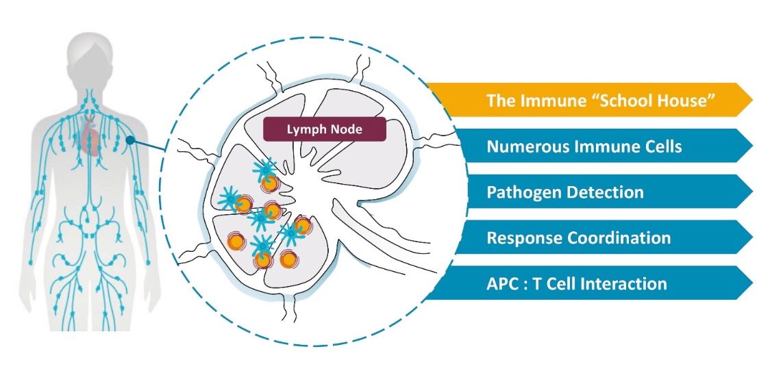 The lymphatic system plays a major role in the production, differentiation, and proliferation of both B cells and T cells, and the lymph nodes serve a critical role in lymphocyte activation and acquisition of essential functionality. As noted in the figure below, the lymph nodes act as the schoolhouse of the immune system and play a key role in activating the immune system in response to detected threats from cancer and pathogens.