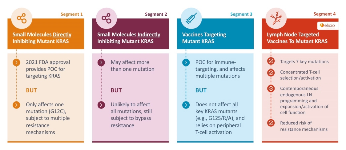 Other mKRAS-targeted therapeutic cancer vaccines have been studied in humans. Elicio believes the results of these trials, though insufficient to result in regulatory approval due to shortcomings of these prior approaches, provide support for the use of a mKRAS-targeted therapeutic cancer vaccine. Further, Elicio expects a lymph node targeting AMP construct to potentially generate additional efficacy through induction of a much stronger immune response compared to a non-lymph node targeted agent.