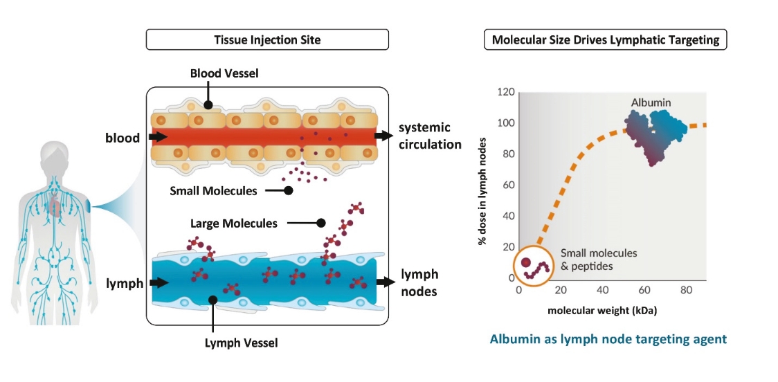 The left side of the figure below shows how vaccines, and some immunotherapies, rapidly enter the bloodstream after injection into tissues and circulate to sites that are either immunologically insignificant or tolerogenic, hindering their ability to effectively activate immune cells or increasing accumulation in areas where the immune response is suppressed. The right side shows the distribution of the agents is controlled by their molecular size. Smaller molecules tend to be distributed more substantially by blood vessels to irrelevant sites, while larger molecules like protein albumin are effectively collected by lymph vessels and concentrate in lymph nodes.