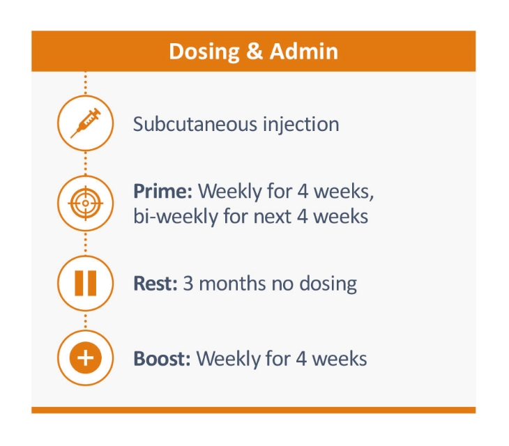Patients are treated with ELI-002 for a period of six months during which they receive a “prime” series of subcutaneous injections, weekly for the first month and then every two weeks for the second month. After a 3-month rest period, the response is “boosted” with weekly doses of ELI-002 for another month. This is analogous to many standard vaccination programs with the initial “prime” and later “boost” period.