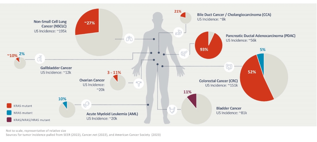 While ELI-002 is initially being studied in patients with mKRAS-driven PDAC, CRC, and NSCLC, there remains significant opportunity in additional mKRAS-driven cancers, as seen in the figure above. Other cancers with significant proportions of KRAS mutations include bile duct and ovarian cancers. In addition to other cancer types, ELI-002 also has the ability to treat cancers with mutations at all three RAS isoforms including NRAS and HRAS, as well as KRAS, providing the potential to treat additional patient populations with unmet need in cancers including bladder, gallbladder, and acute myeloid leukemia (AML).