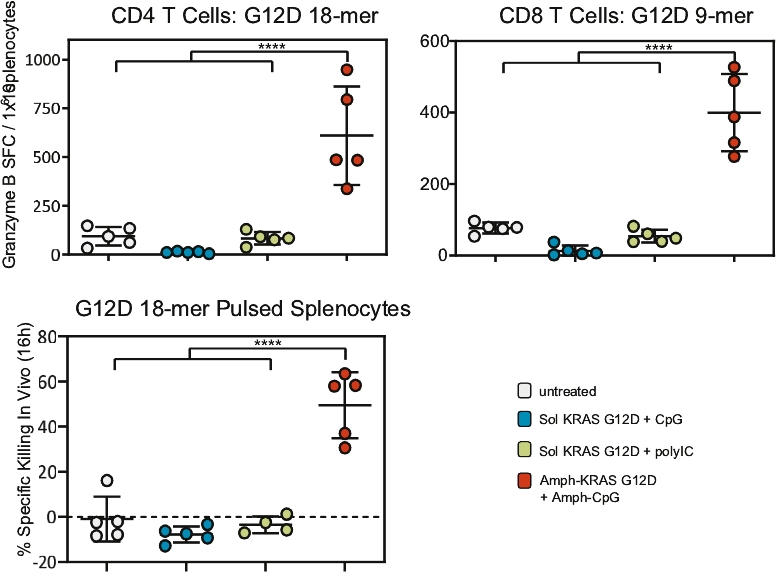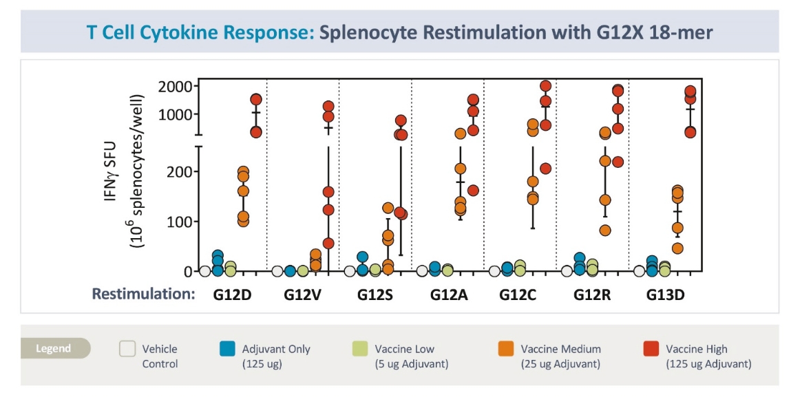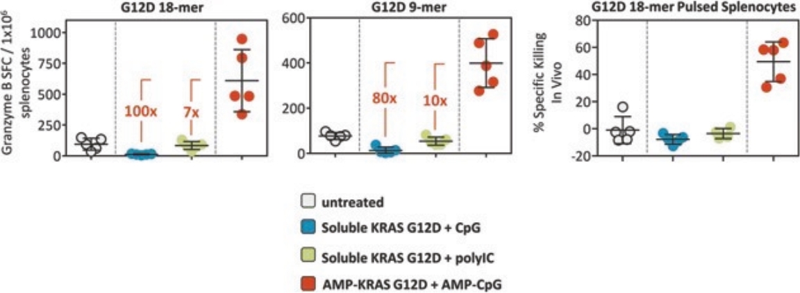 These studies demonstrate the ability of an AMP vaccine to produce an enhanced immune response in mice with mean activity enhanced 40-fold compared to soluble G12V peptide plus soluble adjuvant, at least 60-fold compared to soluble G12R peptide plus adjuvant, and 400-fold compared to soluble G12D peptide plus adjuvant.