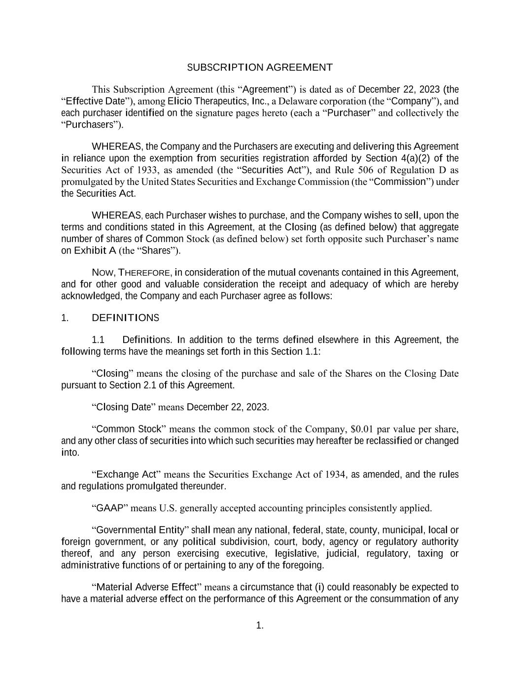 1. SUBSCRIPTION AGREEMENT This Subscription Agreement (this “Agreement”) is dated as of December 22, 2023 (the “Effective Date”), among Elicio Therapeutics, Inc., a Delaware corporation (the “Company”), and each purchaser identified on the signature pages hereto (each a “Purchaser” and collectively the “Purchasers”). WHEREAS, the Company and the Purchasers are executing and delivering this Agreement in reliance upon the exemption from securities registration afforded by Section 4(a)(2) of the Securities Act of 1933, as amended (the “Securities Act”), and Rule 506 of Regulation D as promulgated by the United States Securities and Exchange Commission (the “Commission”) under the Securities Act. WHEREAS, each Purchaser wishes to purchase, and the Company wishes to sell, upon the terms and conditions stated in this Agreement, at the Closing (as defined below) that aggregate number of shares of Common Stock (as defined below) set forth opposite such Purchaser’s name on Exhibit A (the “Shares”). NOW, THEREFORE, in consideration of the mutual covenants contained in this Agreement, and for other good and valuable consideration the receipt and adequacy of which are hereby acknowledged, the Company and each Purchaser agree as follows: 1. DEFINITIONS 1.1 Definitions. In addition to the terms defined elsewhere in this Agreement, the following terms have the meanings set forth in this Section 1.1: “Closing” means the closing of the purchase and sale of the Shares on the Closing Date pursuant to Section 2.1 of this Agreement. “Closing Date” means December 22, 2023. “Common Stock” means the common stock of the Company, $0.01 par value per share, and any other class of securities into which such securities may hereafter be reclassified or changed into. “Exchange Act” means the Securities Exchange Act of 1934, as amended, and the rules and regulations promulgated thereunder. “GAAP” means U.S. generally accepted accounting principles consistently applied. “Governmental Entity” shall mean any national, federal, state, county, municipal, local or foreign government, or any political subdivision, court, body, agency or regulatory authority thereof, and any person exercising executive, legislative, judicial, regulatory, taxing or administrative functions of or pertaining to any of the foregoing. “Material Adverse Effect” means a circumstance that (i) could reasonably be expected to have a material adverse effect on the performance of this Agreement or the consummation of any