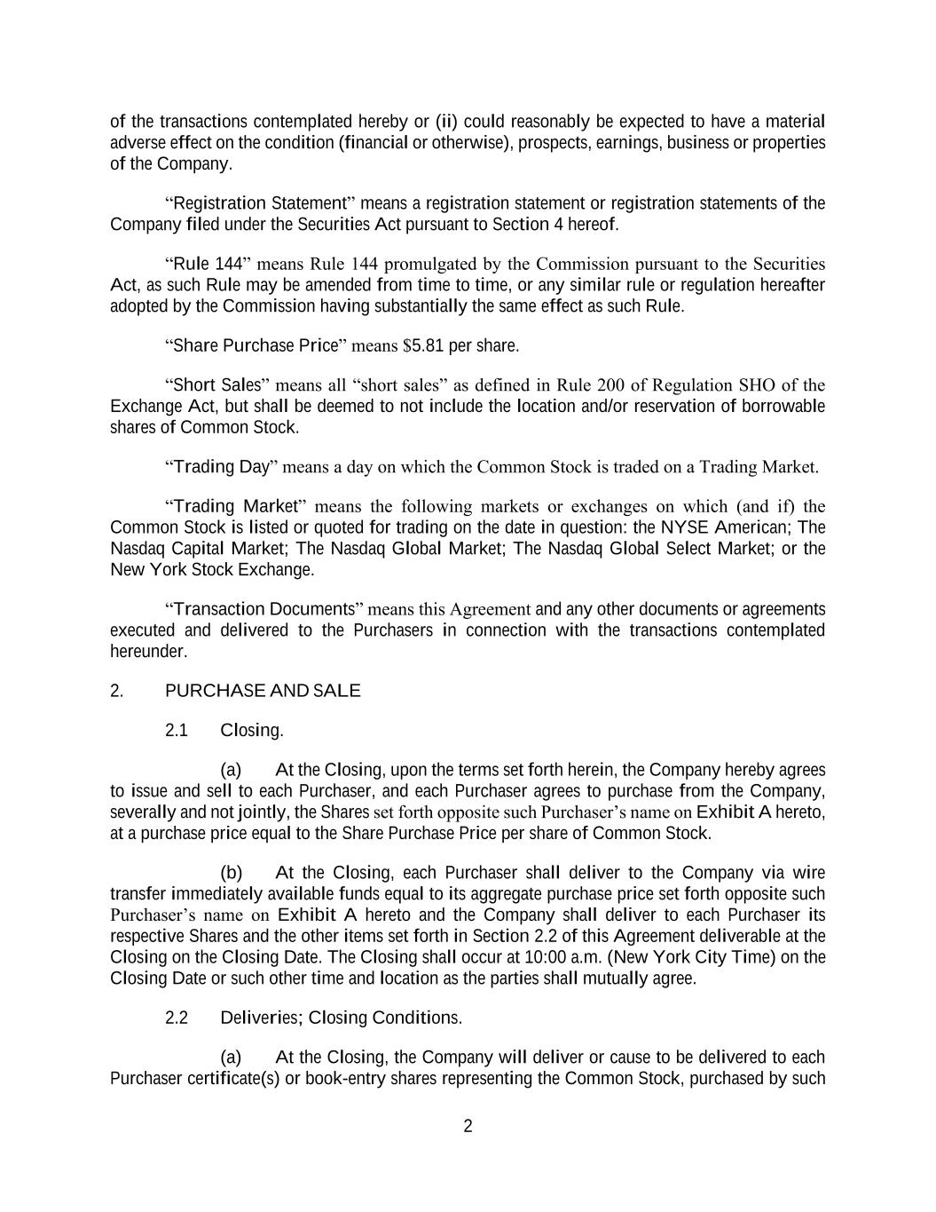 2 of the transactions contemplated hereby or (ii) could reasonably be expected to have a material adverse effect on the condition (financial or otherwise), prospects, earnings, business or properties of the Company. “Registration Statement” means a registration statement or registration statements of the Company filed under the Securities Act pursuant to Section 4 hereof. “Rule 144” means Rule 144 promulgated by the Commission pursuant to the Securities Act, as such Rule may be amended from time to time, or any similar rule or regulation hereafter adopted by the Commission having substantially the same effect as such Rule. “Share Purchase Price” means $5.81 per share. “Short Sales” means all “short sales” as defined in Rule 200 of Regulation SHO of the Exchange Act, but shall be deemed to not include the location and/or reservation of borrowable shares of Common Stock. “Trading Day” means a day on which the Common Stock is traded on a Trading Market. “Trading Market” means the following markets or exchanges on which (and if) the Common Stock is listed or quoted for trading on the date in question: the NYSE American; The Nasdaq Capital Market; The Nasdaq Global Market; The Nasdaq Global Select Market; or the New York Stock Exchange. “Transaction Documents” means this Agreement and any other documents or agreements executed and delivered to the Purchasers in connection with the transactions contemplated hereunder. 2. PURCHASE AND SALE 2.1 Closing. (a) At the Closing, upon the terms set forth herein, the Company hereby agrees to issue and sell to each Purchaser, and each Purchaser agrees to purchase from the Company, severally and not jointly, the Shares set forth opposite such Purchaser’s name on Exhibit A hereto, at a purchase price equal to the Share Purchase Price per share of Common Stock. (b) At the Closing, each Purchaser shall deliver to the Company via wire transfer immediately available funds equal to its aggregate purchase price set forth opposite such Purchaser’s name on Exhibit A hereto and the Company shall deliver to each Purchaser its respective Shares and the other items set forth in Section 2.2 of this Agreement deliverable at the Closing on the Closing Date. The Closing shall occur at 10:00 a.m. (New York City Time) on the Closing Date or such other time and location as the parties shall mutually agree. 2.2 Deliveries; Closing Conditions. (a) At the Closing, the Company will deliver or cause to be delivered to each Purchaser certificate(s) or book-entry shares representing the Common Stock, purchased by such