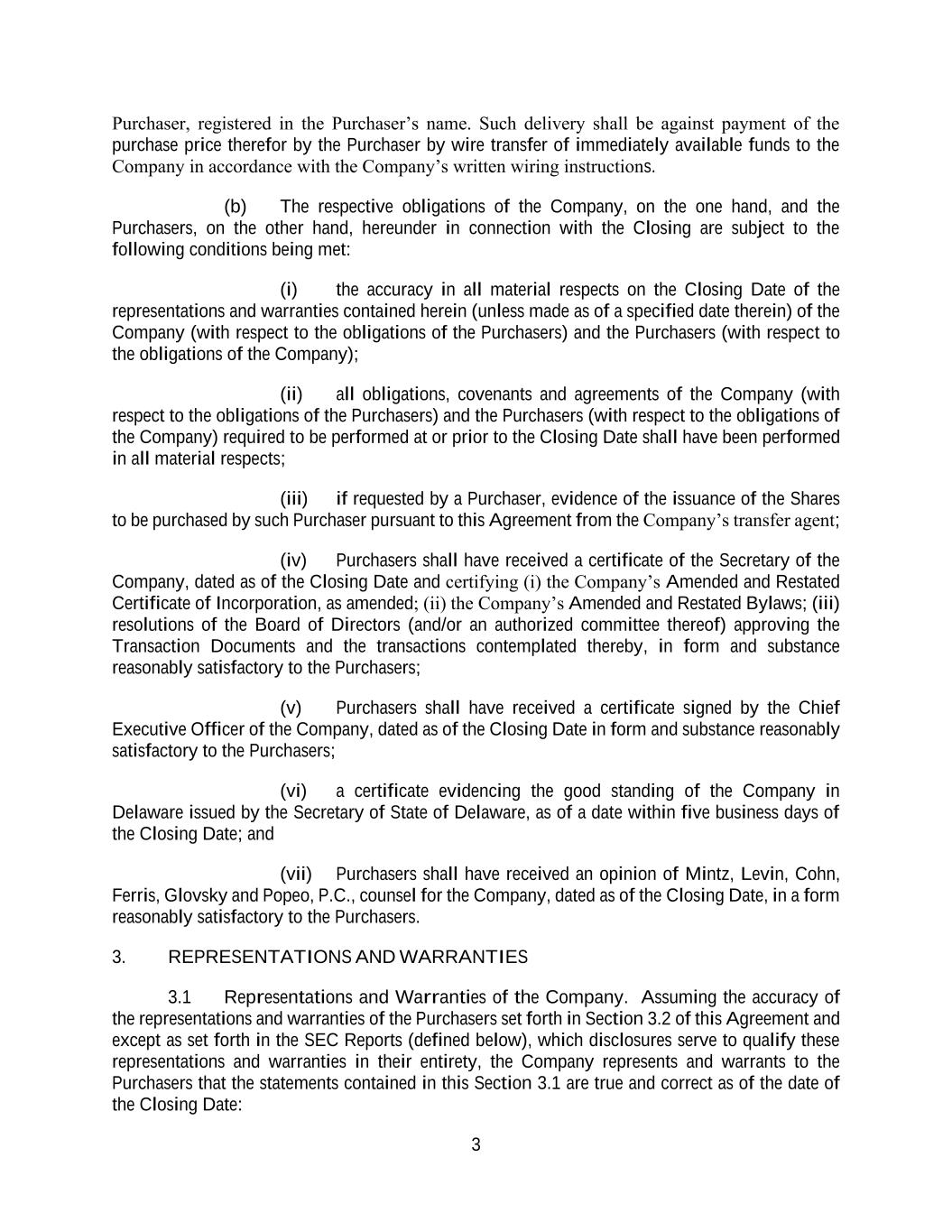 3 Purchaser, registered in the Purchaser’s name. Such delivery shall be against payment of the purchase price therefor by the Purchaser by wire transfer of immediately available funds to the Company in accordance with the Company’s written wiring instructions. (b) The respective obligations of the Company, on the one hand, and the Purchasers, on the other hand, hereunder in connection with the Closing are subject to the following conditions being met: (i) the accuracy in all material respects on the Closing Date of the representations and warranties contained herein (unless made as of a specified date therein) of the Company (with respect to the obligations of the Purchasers) and the Purchasers (with respect to the obligations of the Company); (ii) all obligations, covenants and agreements of the Company (with respect to the obligations of the Purchasers) and the Purchasers (with respect to the obligations of the Company) required to be performed at or prior to the Closing Date shall have been performed in all material respects; (iii) if requested by a Purchaser, evidence of the issuance of the Shares to be purchased by such Purchaser pursuant to this Agreement from the Company’s transfer agent; (iv) Purchasers shall have received a certificate of the Secretary of the Company, dated as of the Closing Date and certifying (i) the Company’s Amended and Restated Certificate of Incorporation, as amended; (ii) the Company’s Amended and Restated Bylaws; (iii) resolutions of the Board of Directors (and/or an authorized committee thereof) approving the Transaction Documents and the transactions contemplated thereby, in form and substance reasonably satisfactory to the Purchasers; (v) Purchasers shall have received a certificate signed by the Chief Executive Officer of the Company, dated as of the Closing Date in form and substance reasonably satisfactory to the Purchasers; (vi) a certificate evidencing the good standing of the Company in Delaware issued by the Secretary of State of Delaware, as of a date within five business days of the Closing Date; and (vii) Purchasers shall have received an opinion of Mintz, Levin, Cohn, Ferris, Glovsky and Popeo, P.C., counsel for the Company, dated as of the Closing Date, in a form reasonably satisfactory to the Purchasers. 3. REPRESENTATIONS AND WARRANTIES 3.1 Representations and Warranties of the Company. Assuming the accuracy of the representations and warranties of the Purchasers set forth in Section 3.2 of this Agreement and except as set forth in the SEC Reports (defined below), which disclosures serve to qualify these representations and warranties in their entirety, the Company represents and warrants to the Purchasers that the statements contained in this Section 3.1 are true and correct as of the date of the Closing Date: