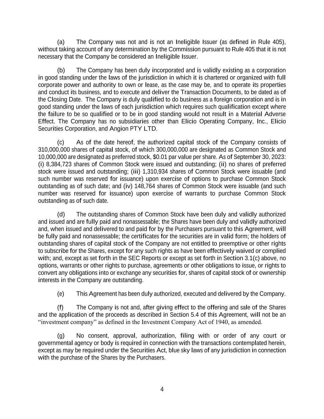 4 (a) The Company was not and is not an Ineligible Issuer (as defined in Rule 405), without taking account of any determination by the Commission pursuant to Rule 405 that it is not necessary that the Company be considered an Ineligible Issuer. (b) The Company has been duly incorporated and is validly existing as a corporation in good standing under the laws of the jurisdiction in which it is chartered or organized with full corporate power and authority to own or lease, as the case may be, and to operate its properties and conduct its business, and to execute and deliver the Transaction Documents, to be dated as of the Closing Date. The Company is duly qualified to do business as a foreign corporation and is in good standing under the laws of each jurisdiction which requires such qualification except where the failure to be so qualified or to be in good standing would not result in a Material Adverse Effect. The Company has no subsidiaries other than Elicio Operating Company, Inc., Elicio Securities Corporation, and Angion PTY LTD. (c) As of the date hereof, the authorized capital stock of the Company consists of 310,000,000 shares of capital stock, of which 300,000,000 are designated as Common Stock and 10,000,000 are designated as preferred stock, $0.01 par value per share. As of September 30, 2023: (i) 8,384,723 shares of Common Stock were issued and outstanding; (ii) no shares of preferred stock were issued and outstanding; (iii) 1,310,934 shares of Common Stock were issuable (and such number was reserved for issuance) upon exercise of options to purchase Common Stock outstanding as of such date; and (iv) 148,764 shares of Common Stock were issuable (and such number was reserved for issuance) upon exercise of warrants to purchase Common Stock outstanding as of such date. (d) The outstanding shares of Common Stock have been duly and validly authorized and issued and are fully paid and nonassessable; the Shares have been duly and validly authorized and, when issued and delivered to and paid for by the Purchasers pursuant to this Agreement, will be fully paid and nonassessable; the certificates for the securities are in valid form; the holders of outstanding shares of capital stock of the Company are not entitled to preemptive or other rights to subscribe for the Shares, except for any such rights as have been effectively waived or complied with; and, except as set forth in the SEC Reports or except as set forth in Section 3.1(c) above, no options, warrants or other rights to purchase, agreements or other obligations to issue, or rights to convert any obligations into or exchange any securities for, shares of capital stock of or ownership interests in the Company are outstanding. (e) This Agreement has been duly authorized, executed and delivered by the Company. (f) The Company is not and, after giving effect to the offering and sale of the Shares and the application of the proceeds as described in Section 5.4 of this Agreement, will not be an “investment company” as defined in the Investment Company Act of 1940, as amended. (g) No consent, approval, authorization, filing with or order of any court or governmental agency or body is required in connection with the transactions contemplated herein, except as may be required under the Securities Act, blue sky laws of any jurisdiction in connection with the purchase of the Shares by the Purchasers.