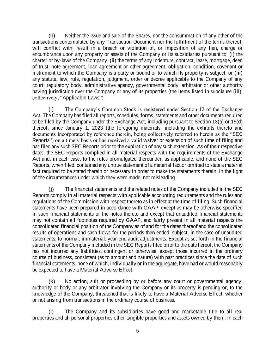 5 (h) Neither the issue and sale of the Shares, nor the consummation of any other of the transactions contemplated by any Transaction Document nor the fulfillment of the terms thereof, will conflict with, result in a breach or violation of, or imposition of any lien, charge or encumbrance upon any property or assets of the Company or its subsidiaries pursuant to, (i) the charter or by-laws of the Company, (ii) the terms of any indenture, contract, lease, mortgage, deed of trust, note agreement, loan agreement or other agreement, obligation, condition, covenant or instrument to which the Company is a party or bound or to which its property is subject, or (iii) any statute, law, rule, regulation, judgment, order or decree applicable to the Company of any court, regulatory body, administrative agency, governmental body, arbitrator or other authority having jurisdiction over the Company or any of its properties (the items listed in subclause (iii), collectively, “Applicable Laws”). (i) The Company’s Common Stock is registered under Section 12 of the Exchange Act. The Company has filed all reports, schedules, forms, statements and other documents required to be filed by the Company under the Exchange Act, including pursuant to Section 13(a) or 15(d) thereof, since January 1, 2023 (the foregoing materials, including the exhibits thereto and documents incorporated by reference therein, being collectively referred to herein as the “SEC Reports”) on a timely basis or has received a valid waiver or extension of such time of filing and has filed any such SEC Reports prior to the expiration of any such extension. As of their respective dates, the SEC Reports complied in all material respects with the requirements of the Exchange Act and, in each case, to the rules promulgated thereunder, as applicable, and none of the SEC Reports, when filed, contained any untrue statement of a material fact or omitted to state a material fact required to be stated therein or necessary in order to make the statements therein, in the light of the circumstances under which they were made, not misleading. (j) The financial statements and the related notes of the Company included in the SEC Reports comply in all material respects with applicable accounting requirements and the rules and regulations of the Commission with respect thereto as in effect at the time of filing. Such financial statements have been prepared in accordance with GAAP, except as may be otherwise specified in such financial statements or the notes thereto and except that unaudited financial statements may not contain all footnotes required by GAAP, and fairly present in all material respects the consolidated financial position of the Company as of and for the dates thereof and the consolidated results of operations and cash flows for the periods then ended, subject, in the case of unaudited statements, to normal, immaterial, year-end audit adjustments. Except as set forth in the financial statements of the Company included in the SEC Reports filed prior to the date hereof, the Company has not incurred any liabilities, contingent or otherwise, except those incurred in the ordinary course of business, consistent (as to amount and nature) with past practices since the date of such financial statements, none of which, individually or in the aggregate, have had or would reasonably be expected to have a Material Adverse Effect. (k) No action, suit or proceeding by or before any court or governmental agency, authority or body or any arbitrator involving the Company or its property is pending or, to the knowledge of the Company, threatened that is likely to have a Material Adverse Effect, whether or not arising from transactions in the ordinary course of business. (l) The Company and its subsidiaries have good and marketable title to all real properties and all personal properties other tangible properties and assets owned by them, in each