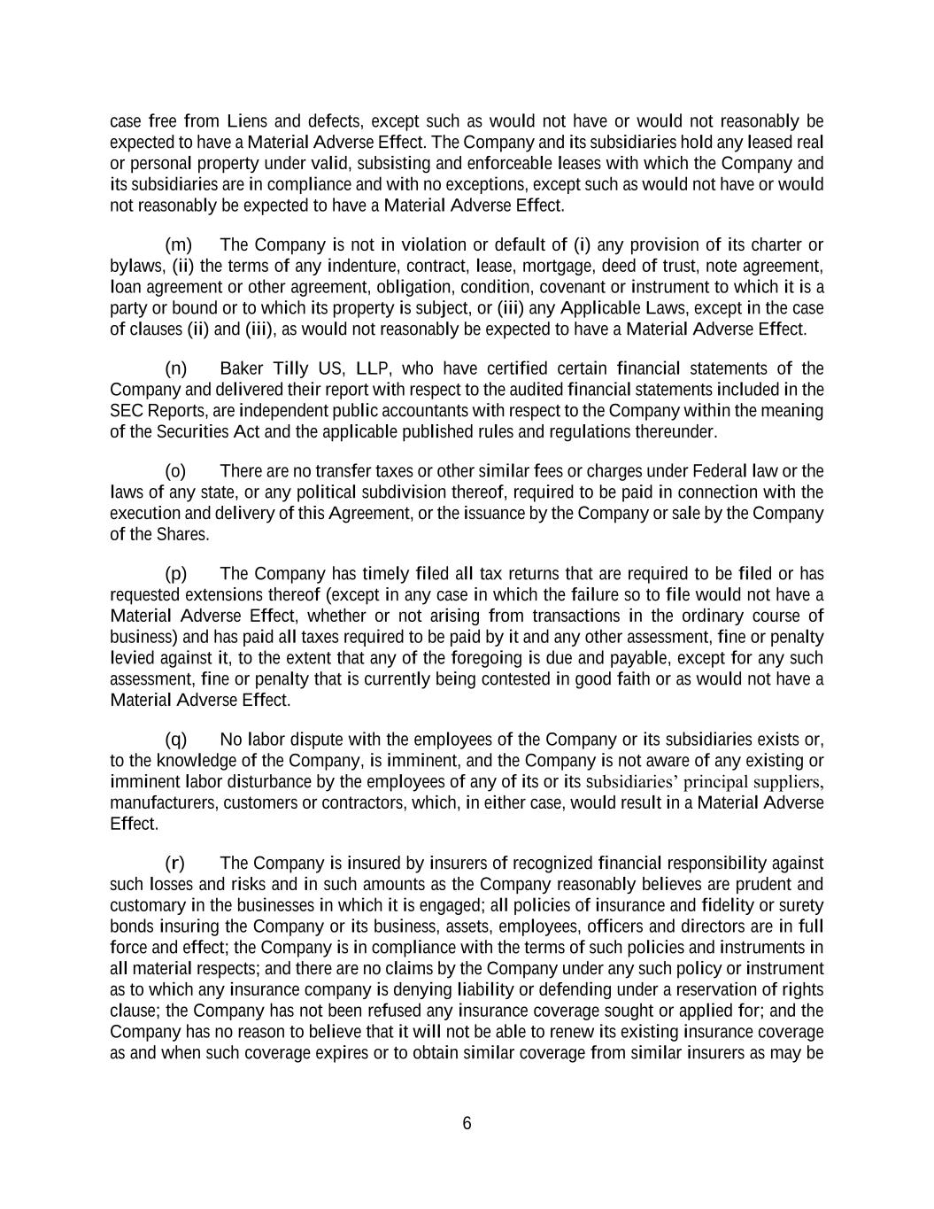 6 case free from Liens and defects, except such as would not have or would not reasonably be expected to have a Material Adverse Effect. The Company and its subsidiaries hold any leased real or personal property under valid, subsisting and enforceable leases with which the Company and its subsidiaries are in compliance and with no exceptions, except such as would not have or would not reasonably be expected to have a Material Adverse Effect. (m) The Company is not in violation or default of (i) any provision of its charter or bylaws, (ii) the terms of any indenture, contract, lease, mortgage, deed of trust, note agreement, loan agreement or other agreement, obligation, condition, covenant or instrument to which it is a party or bound or to which its property is subject, or (iii) any Applicable Laws, except in the case of clauses (ii) and (iii), as would not reasonably be expected to have a Material Adverse Effect. (n) Baker Tilly US, LLP, who have certified certain financial statements of the Company and delivered their report with respect to the audited financial statements included in the SEC Reports, are independent public accountants with respect to the Company within the meaning of the Securities Act and the applicable published rules and regulations thereunder. (o) There are no transfer taxes or other similar fees or charges under Federal law or the laws of any state, or any political subdivision thereof, required to be paid in connection with the execution and delivery of this Agreement, or the issuance by the Company or sale by the Company of the Shares. (p) The Company has timely filed all tax returns that are required to be filed or has requested extensions thereof (except in any case in which the failure so to file would not have a Material Adverse Effect, whether or not arising from transactions in the ordinary course of business) and has paid all taxes required to be paid by it and any other assessment, fine or penalty levied against it, to the extent that any of the foregoing is due and payable, except for any such assessment, fine or penalty that is currently being contested in good faith or as would not have a Material Adverse Effect. (q) No labor dispute with the employees of the Company or its subsidiaries exists or, to the knowledge of the Company, is imminent, and the Company is not aware of any existing or imminent labor disturbance by the employees of any of its or its subsidiaries’ principal suppliers, manufacturers, customers or contractors, which, in either case, would result in a Material Adverse Effect. (r) The Company is insured by insurers of recognized financial responsibility against such losses and risks and in such amounts as the Company reasonably believes are prudent and customary in the businesses in which it is engaged; all policies of insurance and fidelity or surety bonds insuring the Company or its business, assets, employees, officers and directors are in full force and effect; the Company is in compliance with the terms of such policies and instruments in all material respects; and there are no claims by the Company under any such policy or instrument as to which any insurance company is denying liability or defending under a reservation of rights clause; the Company has not been refused any insurance coverage sought or applied for; and the Company has no reason to believe that it will not be able to renew its existing insurance coverage as and when such coverage expires or to obtain similar coverage from similar insurers as may be