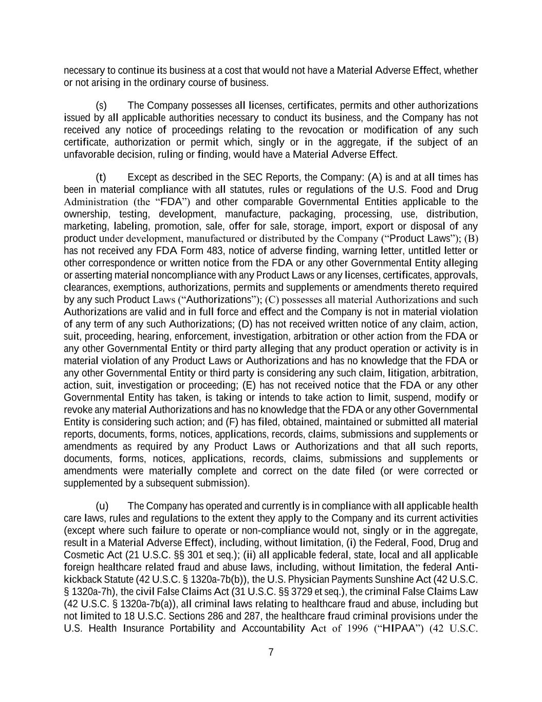 7 necessary to continue its business at a cost that would not have a Material Adverse Effect, whether or not arising in the ordinary course of business. (s) The Company possesses all licenses, certificates, permits and other authorizations issued by all applicable authorities necessary to conduct its business, and the Company has not received any notice of proceedings relating to the revocation or modification of any such certificate, authorization or permit which, singly or in the aggregate, if the subject of an unfavorable decision, ruling or finding, would have a Material Adverse Effect. (t) Except as described in the SEC Reports, the Company: (A) is and at all times has been in material compliance with all statutes, rules or regulations of the U.S. Food and Drug Administration (the “FDA”) and other comparable Governmental Entities applicable to the ownership, testing, development, manufacture, packaging, processing, use, distribution, marketing, labeling, promotion, sale, offer for sale, storage, import, export or disposal of any product under development, manufactured or distributed by the Company (“Product Laws”); (B) has not received any FDA Form 483, notice of adverse finding, warning letter, untitled letter or other correspondence or written notice from the FDA or any other Governmental Entity alleging or asserting material noncompliance with any Product Laws or any licenses, certificates, approvals, clearances, exemptions, authorizations, permits and supplements or amendments thereto required by any such Product Laws (“Authorizations”); (C) possesses all material Authorizations and such Authorizations are valid and in full force and effect and the Company is not in material violation of any term of any such Authorizations; (D) has not received written notice of any claim, action, suit, proceeding, hearing, enforcement, investigation, arbitration or other action from the FDA or any other Governmental Entity or third party alleging that any product operation or activity is in material violation of any Product Laws or Authorizations and has no knowledge that the FDA or any other Governmental Entity or third party is considering any such claim, litigation, arbitration, action, suit, investigation or proceeding; (E) has not received notice that the FDA or any other Governmental Entity has taken, is taking or intends to take action to limit, suspend, modify or revoke any material Authorizations and has no knowledge that the FDA or any other Governmental Entity is considering such action; and (F) has filed, obtained, maintained or submitted all material reports, documents, forms, notices, applications, records, claims, submissions and supplements or amendments as required by any Product Laws or Authorizations and that all such reports, documents, forms, notices, applications, records, claims, submissions and supplements or amendments were materially complete and correct on the date filed (or were corrected or supplemented by a subsequent submission). (u) The Company has operated and currently is in compliance with all applicable health care laws, rules and regulations to the extent they apply to the Company and its current activities (except where such failure to operate or non-compliance would not, singly or in the aggregate, result in a Material Adverse Effect), including, without limitation, (i) the Federal, Food, Drug and Cosmetic Act (21 U.S.C. §§ 301 et seq.); (ii) all applicable federal, state, local and all applicable foreign healthcare related fraud and abuse laws, including, without limitation, the federal Anti- kickback Statute (42 U.S.C. § 1320a-7b(b)), the U.S. Physician Payments Sunshine Act (42 U.S.C. § 1320a-7h), the civil False Claims Act (31 U.S.C. §§ 3729 et seq.), the criminal False Claims Law (42 U.S.C. § 1320a-7b(a)), all criminal laws relating to healthcare fraud and abuse, including but not limited to 18 U.S.C. Sections 286 and 287, the healthcare fraud criminal provisions under the U.S. Health Insurance Portability and Accountability Act of 1996 (“HIPAA”) (42 U.S.C.