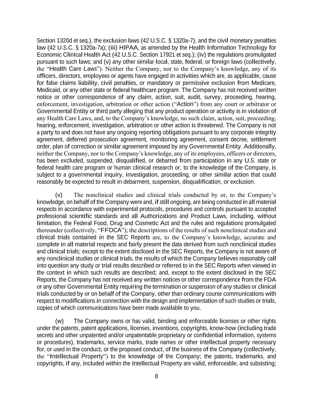 8 Section 1320d et seq.), the exclusion laws (42 U.S.C. § 1320a-7), and the civil monetary penalties law (42 U.S.C. § 1320a-7a); (iii) HIPAA, as amended by the Health Information Technology for Economic Clinical Health Act (42 U.S.C. Section 17921 et seq.); (iv) the regulations promulgated pursuant to such laws; and (v) any other similar local, state, federal, or foreign laws (collectively, the “Health Care Laws”). Neither the Company, nor to the Company’s knowledge, any of its officers, directors, employees or agents have engaged in activities which are, as applicable, cause for false claims liability, civil penalties, or mandatory or permissive exclusion from Medicare, Medicaid, or any other state or federal healthcare program. The Company has not received written notice or other correspondence of any claim, action, suit, audit, survey, proceeding, hearing, enforcement, investigation, arbitration or other action (“Action”) from any court or arbitrator or Governmental Entity or third party alleging that any product operation or activity is in violation of any Health Care Laws, and, to the Company’s knowledge, no such claim, action, suit, proceeding, hearing, enforcement, investigation, arbitration or other action is threatened. The Company is not a party to and does not have any ongoing reporting obligations pursuant to any corporate integrity agreement, deferred prosecution agreement, monitoring agreement, consent decree, settlement order, plan of correction or similar agreement imposed by any Governmental Entity. Additionally, neither the Company, nor to the Company’s knowledge, any of its employees, officers or directors, has been excluded, suspended, disqualified, or debarred from participation in any U.S. state or federal health care program or human clinical research or, to the knowledge of the Company, is subject to a governmental inquiry, investigation, proceeding, or other similar action that could reasonably be expected to result in debarment, suspension, disqualification, or exclusion. (v) The nonclinical studies and clinical trials conducted by or, to the Company’s knowledge, on behalf of the Company were and, if still ongoing, are being conducted in all material respects in accordance with experimental protocols, procedures and controls pursuant to accepted professional scientific standards and all Authorizations and Product Laws, including, without limitation, the Federal Food, Drug and Cosmetic Act and the rules and regulations promulgated thereunder (collectively, “FFDCA”); the descriptions of the results of such nonclinical studies and clinical trials contained in the SEC Reports are, to the Company’s knowledge, accurate and complete in all material respects and fairly present the data derived from such nonclinical studies and clinical trials; except to the extent disclosed in the SEC Reports, the Company is not aware of any nonclinical studies or clinical trials, the results of which the Company believes reasonably call into question any study or trial results described or referred to in the SEC Reports when viewed in the context in which such results are described; and, except to the extent disclosed in the SEC Reports, the Company has not received any written notices or other correspondence from the FDA or any other Governmental Entity requiring the termination or suspension of any studies or clinical trials conducted by or on behalf of the Company, other than ordinary course communications with respect to modifications in connection with the design and implementation of such studies or trials, copies of which communications have been made available to you. (w) The Company owns or has valid, binding and enforceable licenses or other rights under the patents, patent applications, licenses, inventions, copyrights, know-how (including trade secrets and other unpatented and/or unpatentable proprietary or confidential information, systems or procedures), trademarks, service marks, trade names or other intellectual property necessary for, or used in the conduct, or the proposed conduct, of the business of the Company (collectively, the “Intellectual Property”) to the knowledge of the Company; the patents, trademarks, and copyrights, if any, included within the Intellectual Property are valid, enforceable, and subsisting;