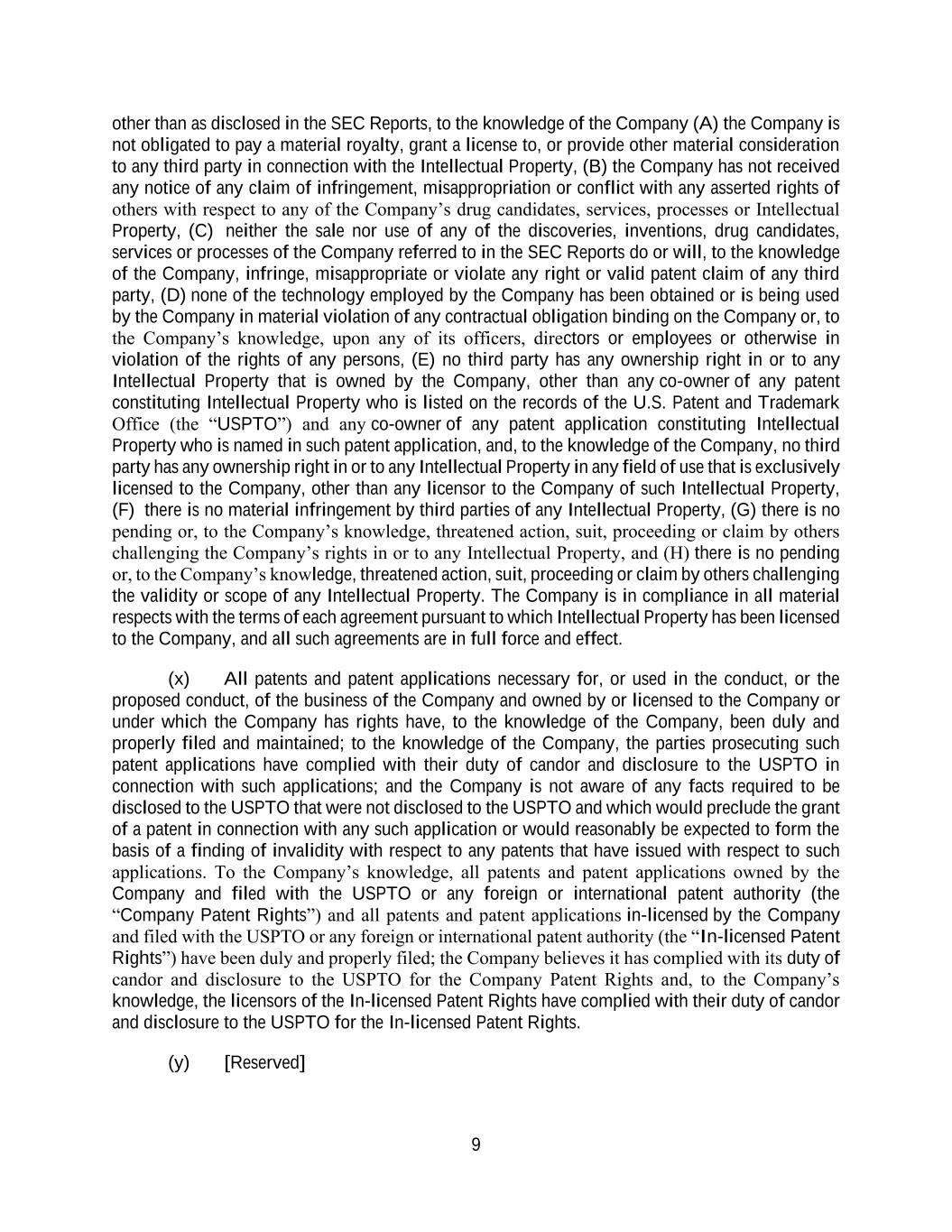 9 other than as disclosed in the SEC Reports, to the knowledge of the Company (A) the Company is not obligated to pay a material royalty, grant a license to, or provide other material consideration to any third party in connection with the Intellectual Property, (B) the Company has not received any notice of any claim of infringement, misappropriation or conflict with any asserted rights of others with respect to any of the Company’s drug candidates, services, processes or Intellectual Property, (C) neither the sale nor use of any of the discoveries, inventions, drug candidates, services or processes of the Company referred to in the SEC Reports do or will, to the knowledge of the Company, infringe, misappropriate or violate any right or valid patent claim of any third party, (D) none of the technology employed by the Company has been obtained or is being used by the Company in material violation of any contractual obligation binding on the Company or, to the Company’s knowledge, upon any of its officers, directors or employees or otherwise in violation of the rights of any persons, (E) no third party has any ownership right in or to any Intellectual Property that is owned by the Company, other than any co-owner of any patent constituting Intellectual Property who is listed on the records of the U.S. Patent and Trademark Office (the “USPTO”) and any co-owner of any patent application constituting Intellectual Property who is named in such patent application, and, to the knowledge of the Company, no third party has any ownership right in or to any Intellectual Property in any field of use that is exclusively licensed to the Company, other than any licensor to the Company of such Intellectual Property, (F) there is no material infringement by third parties of any Intellectual Property, (G) there is no pending or, to the Company’s knowledge, threatened action, suit, proceeding or claim by others challenging the Company’s rights in or to any Intellectual Property, and (H) there is no pending or, to the Company’s knowledge, threatened action, suit, proceeding or claim by others challenging the validity or scope of any Intellectual Property. The Company is in compliance in all material respects with the terms of each agreement pursuant to which Intellectual Property has been licensed to the Company, and all such agreements are in full force and effect. (x) All patents and patent applications necessary for, or used in the conduct, or the proposed conduct, of the business of the Company and owned by or licensed to the Company or under which the Company has rights have, to the knowledge of the Company, been duly and properly filed and maintained; to the knowledge of the Company, the parties prosecuting such patent applications have complied with their duty of candor and disclosure to the USPTO in connection with such applications; and the Company is not aware of any facts required to be disclosed to the USPTO that were not disclosed to the USPTO and which would preclude the grant of a patent in connection with any such application or would reasonably be expected to form the basis of a finding of invalidity with respect to any patents that have issued with respect to such applications. To the Company’s knowledge, all patents and patent applications owned by the Company and filed with the USPTO or any foreign or international patent authority (the “Company Patent Rights”) and all patents and patent applications in-licensed by the Company and filed with the USPTO or any foreign or international patent authority (the “In-licensed Patent Rights”) have been duly and properly filed; the Company believes it has complied with its duty of candor and disclosure to the USPTO for the Company Patent Rights and, to the Company’s knowledge, the licensors of the In-licensed Patent Rights have complied with their duty of candor and disclosure to the USPTO for the In-licensed Patent Rights. (y) [Reserved]