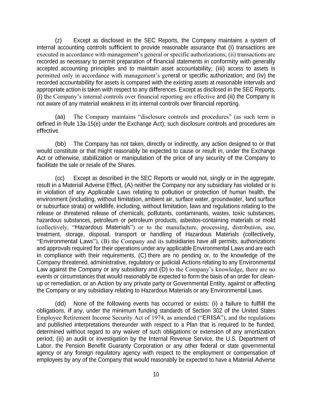 10 (z) Except as disclosed in the SEC Reports, the Company maintains a system of internal accounting controls sufficient to provide reasonable assurance that (i) transactions are executed in accordance with management’s general or specific authorizations; (ii) transactions are recorded as necessary to permit preparation of financial statements in conformity with generally accepted accounting principles and to maintain asset accountability; (iii) access to assets is permitted only in accordance with management’s general or specific authorization; and (iv) the recorded accountability for assets is compared with the existing assets at reasonable intervals and appropriate action is taken with respect to any differences. Except as disclosed in the SEC Reports, (i) the Company’s internal controls over financial reporting are effective and (ii) the Company is not aware of any material weakness in its internal controls over financial reporting. (aa) The Company maintains “disclosure controls and procedures” (as such term is defined in Rule 13a-15(e) under the Exchange Act); such disclosure controls and procedures are effective. (bb) The Company has not taken, directly or indirectly, any action designed to or that would constitute or that might reasonably be expected to cause or result in, under the Exchange Act or otherwise, stabilization or manipulation of the price of any security of the Company to facilitate the sale or resale of the Shares. (cc) Except as described in the SEC Reports or would not, singly or in the aggregate, result in a Material Adverse Effect, (A) neither the Company nor any subsidiary has violated or is in violation of any Applicable Laws relating to pollution or protection of human health, the environment (including, without limitation, ambient air, surface water, groundwater, land surface or subsurface strata) or wildlife, including, without limitation, laws and regulations relating to the release or threatened release of chemicals, pollutants, contaminants, wastes, toxic substances, hazardous substances, petroleum or petroleum products, asbestos-containing materials or mold (collectively, “Hazardous Materials”) or to the manufacture, processing, distribution, use, treatment, storage, disposal, transport or handling of Hazardous Materials (collectively, “Environmental Laws”), (B) the Company and its subsidiaries have all permits, authorizations and approvals required for their operations under any applicable Environmental Laws and are each in compliance with their requirements, (C) there are no pending or, to the knowledge of the Company threatened, administrative, regulatory or judicial Actions relating to any Environmental Law against the Company or any subsidiary and (D) to the Company’s knowledge, there are no events or circumstances that would reasonably be expected to form the basis of an order for clean- up or remediation, or an Action by any private party or Governmental Entity, against or affecting the Company or any subsidiary relating to Hazardous Materials or any Environmental Laws. (dd) None of the following events has occurred or exists: (i) a failure to fulfill the obligations, if any, under the minimum funding standards of Section 302 of the United States Employee Retirement Income Security Act of 1974, as amended (“ERISA”), and the regulations and published interpretations thereunder with respect to a Plan that is required to be funded, determined without regard to any waiver of such obligations or extension of any amortization period; (ii) an audit or investigation by the Internal Revenue Service, the U.S. Department of Labor, the Pension Benefit Guaranty Corporation or any other federal or state governmental agency or any foreign regulatory agency with respect to the employment or compensation of employees by any of the Company that would reasonably be expected to have a Material Adverse