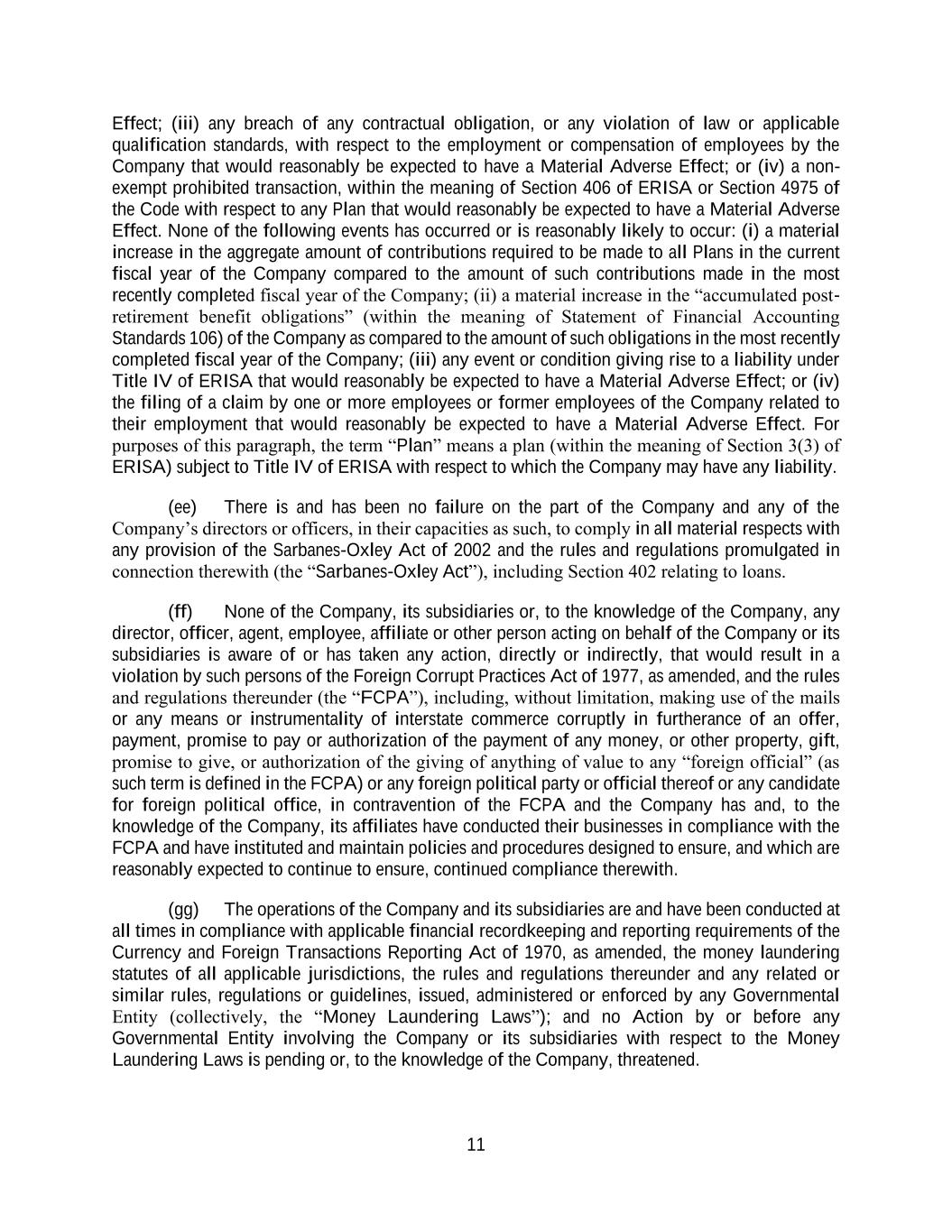 11 Effect; (iii) any breach of any contractual obligation, or any violation of law or applicable qualification standards, with respect to the employment or compensation of employees by the Company that would reasonably be expected to have a Material Adverse Effect; or (iv) a non- exempt prohibited transaction, within the meaning of Section 406 of ERISA or Section 4975 of the Code with respect to any Plan that would reasonably be expected to have a Material Adverse Effect. None of the following events has occurred or is reasonably likely to occur: (i) a material increase in the aggregate amount of contributions required to be made to all Plans in the current fiscal year of the Company compared to the amount of such contributions made in the most recently completed fiscal year of the Company; (ii) a material increase in the “accumulated post- retirement benefit obligations” (within the meaning of Statement of Financial Accounting Standards 106) of the Company as compared to the amount of such obligations in the most recently completed fiscal year of the Company; (iii) any event or condition giving rise to a liability under Title IV of ERISA that would reasonably be expected to have a Material Adverse Effect; or (iv) the filing of a claim by one or more employees or former employees of the Company related to their employment that would reasonably be expected to have a Material Adverse Effect. For purposes of this paragraph, the term “Plan” means a plan (within the meaning of Section 3(3) of ERISA) subject to Title IV of ERISA with respect to which the Company may have any liability. (ee) There is and has been no failure on the part of the Company and any of the Company’s directors or officers, in their capacities as such, to comply in all material respects with any provision of the Sarbanes-Oxley Act of 2002 and the rules and regulations promulgated in connection therewith (the “Sarbanes-Oxley Act”), including Section 402 relating to loans. (ff) None of the Company, its subsidiaries or, to the knowledge of the Company, any director, officer, agent, employee, affiliate or other person acting on behalf of the Company or its subsidiaries is aware of or has taken any action, directly or indirectly, that would result in a violation by such persons of the Foreign Corrupt Practices Act of 1977, as amended, and the rules and regulations thereunder (the “FCPA”), including, without limitation, making use of the mails or any means or instrumentality of interstate commerce corruptly in furtherance of an offer, payment, promise to pay or authorization of the payment of any money, or other property, gift, promise to give, or authorization of the giving of anything of value to any “foreign official” (as such term is defined in the FCPA) or any foreign political party or official thereof or any candidate for foreign political office, in contravention of the FCPA and the Company has and, to the knowledge of the Company, its affiliates have conducted their businesses in compliance with the FCPA and have instituted and maintain policies and procedures designed to ensure, and which are reasonably expected to continue to ensure, continued compliance therewith. (gg) The operations of the Company and its subsidiaries are and have been conducted at all times in compliance with applicable financial recordkeeping and reporting requirements of the Currency and Foreign Transactions Reporting Act of 1970, as amended, the money laundering statutes of all applicable jurisdictions, the rules and regulations thereunder and any related or similar rules, regulations or guidelines, issued, administered or enforced by any Governmental Entity (collectively, the “Money Laundering Laws”); and no Action by or before any Governmental Entity involving the Company or its subsidiaries with respect to the Money Laundering Laws is pending or, to the knowledge of the Company, threatened.