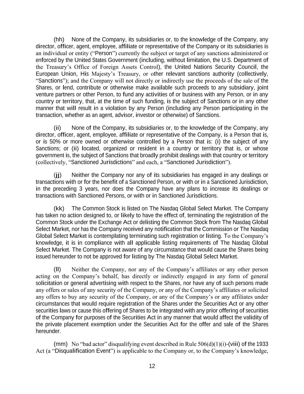 12 (hh) None of the Company, its subsidiaries or, to the knowledge of the Company, any director, officer, agent, employee, affiliate or representative of the Company or its subsidiaries is an individual or entity (“Person”) currently the subject or target of any sanctions administered or enforced by the United States Government (including, without limitation, the U.S. Department of the Treasury’s Office of Foreign Assets Control), the United Nations Security Council, the European Union, His Majesty’s Treasury, or other relevant sanctions authority (collectively, “Sanctions”); and the Company will not directly or indirectly use the proceeds of the sale of the Shares, or lend, contribute or otherwise make available such proceeds to any subsidiary, joint venture partners or other Person, to fund any activities of or business with any Person, or in any country or territory, that, at the time of such funding, is the subject of Sanctions or in any other manner that will result in a violation by any Person (including any Person participating in the transaction, whether as an agent, advisor, investor or otherwise) of Sanctions. (ii) None of the Company, its subsidiaries or, to the knowledge of the Company, any director, officer, agent, employee, affiliate or representative of the Company, is a Person that is, or is 50% or more owned or otherwise controlled by a Person that is: (i) the subject of any Sanctions; or (ii) located, organized or resident in a country or territory that is, or whose government is, the subject of Sanctions that broadly prohibit dealings with that country or territory (collectively, “Sanctioned Jurisdictions” and each, a “Sanctioned Jurisdiction”). (jj) Neither the Company nor any of its subsidiaries has engaged in any dealings or transactions with or for the benefit of a Sanctioned Person, or with or in a Sanctioned Jurisdiction, in the preceding 3 years, nor does the Company have any plans to increase its dealings or transactions with Sanctioned Persons, or with or in Sanctioned Jurisdictions. (kk) The Common Stock is listed on The Nasdaq Global Select Market. The Company has taken no action designed to, or likely to have the effect of, terminating the registration of the Common Stock under the Exchange Act or delisting the Common Stock from The Nasdaq Global Select Market, nor has the Company received any notification that the Commission or The Nasdaq Global Select Market is contemplating terminating such registration or listing. To the Company’s knowledge, it is in compliance with all applicable listing requirements of The Nasdaq Global Select Market. The Company is not aware of any circumstance that would cause the Shares being issued hereunder to not be approved for listing by The Nasdaq Global Select Market. (ll) Neither the Company, nor any of the Company’s affiliates or any other person acting on the Company’s behalf, has directly or indirectly engaged in any form of general solicitation or general advertising with respect to the Shares, nor have any of such persons made any offers or sales of any security of the Company, or any of the Company’s affiliates or solicited any offers to buy any security of the Company, or any of the Company’s or any affiliates under circumstances that would require registration of the Shares under the Securities Act or any other securities laws or cause this offering of Shares to be integrated with any prior offering of securities of the Company for purposes of the Securities Act in any manner that would affect the validity of the private placement exemption under the Securities Act for the offer and sale of the Shares hereunder. (mm) No “bad actor” disqualifying event described in Rule 506(d)(1)(i)-(viii) of the 1933 Act (a “Disqualification Event”) is applicable to the Company or, to the Company’s knowledge,