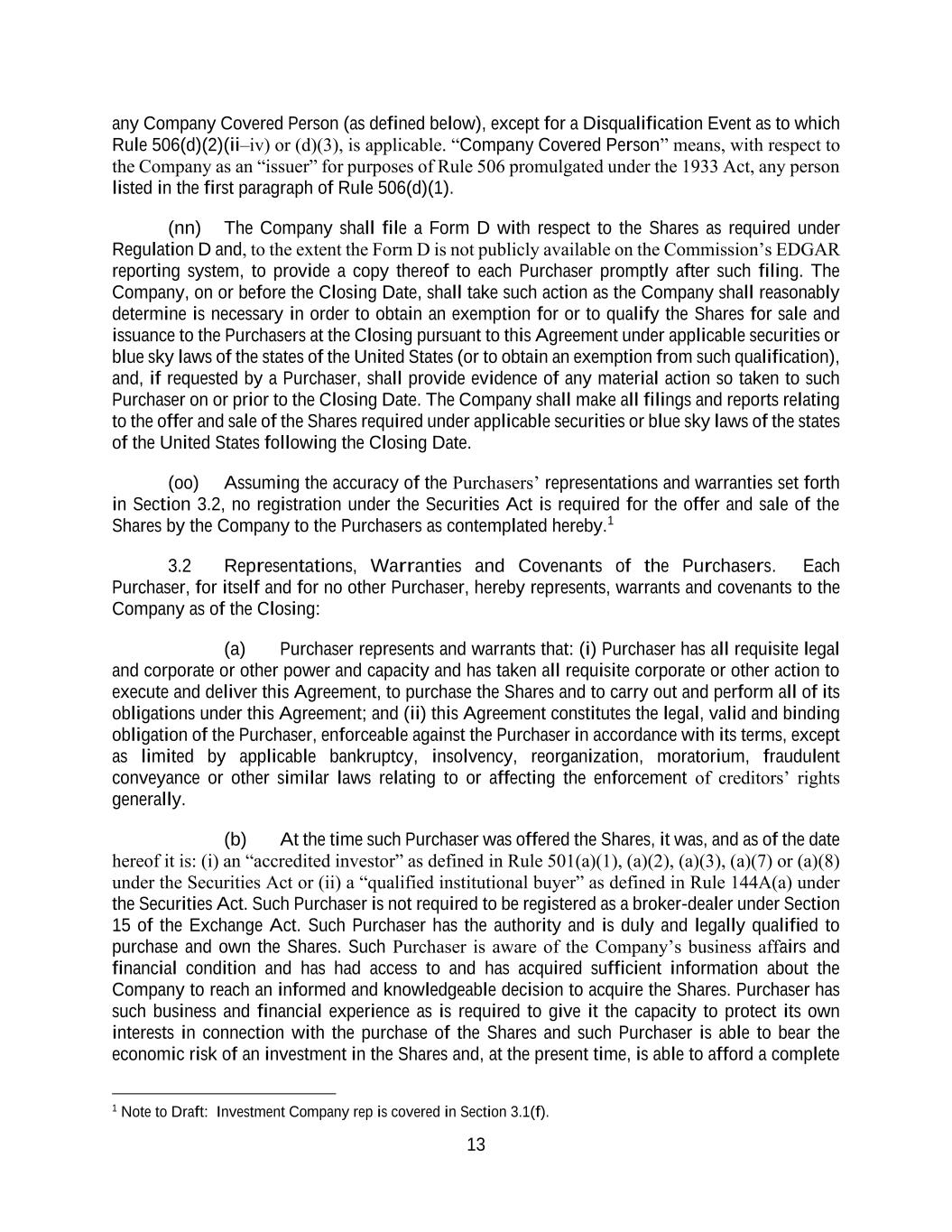 13 any Company Covered Person (as defined below), except for a Disqualification Event as to which Rule 506(d)(2)(ii–iv) or (d)(3), is applicable. “Company Covered Person” means, with respect to the Company as an “issuer” for purposes of Rule 506 promulgated under the 1933 Act, any person listed in the first paragraph of Rule 506(d)(1). (nn) The Company shall file a Form D with respect to the Shares as required under Regulation D and, to the extent the Form D is not publicly available on the Commission’s EDGAR reporting system, to provide a copy thereof to each Purchaser promptly after such filing. The Company, on or before the Closing Date, shall take such action as the Company shall reasonably determine is necessary in order to obtain an exemption for or to qualify the Shares for sale and issuance to the Purchasers at the Closing pursuant to this Agreement under applicable securities or blue sky laws of the states of the United States (or to obtain an exemption from such qualification), and, if requested by a Purchaser, shall provide evidence of any material action so taken to such Purchaser on or prior to the Closing Date. The Company shall make all filings and reports relating to the offer and sale of the Shares required under applicable securities or blue sky laws of the states of the United States following the Closing Date. (oo) Assuming the accuracy of the Purchasers’ representations and warranties set forth in Section 3.2, no registration under the Securities Act is required for the offer and sale of the Shares by the Company to the Purchasers as contemplated hereby.1 3.2 Representations, Warranties and Covenants of the Purchasers. Each Purchaser, for itself and for no other Purchaser, hereby represents, warrants and covenants to the Company as of the Closing: (a) Purchaser represents and warrants that: (i) Purchaser has all requisite legal and corporate or other power and capacity and has taken all requisite corporate or other action to execute and deliver this Agreement, to purchase the Shares and to carry out and perform all of its obligations under this Agreement; and (ii) this Agreement constitutes the legal, valid and binding obligation of the Purchaser, enforceable against the Purchaser in accordance with its terms, except as limited by applicable bankruptcy, insolvency, reorganization, moratorium, fraudulent conveyance or other similar laws relating to or affecting the enforcement of creditors’ rights generally. (b) At the time such Purchaser was offered the Shares, it was, and as of the date hereof it is: (i) an “accredited investor” as defined in Rule 501(a)(1), (a)(2), (a)(3), (a)(7) or (a)(8) under the Securities Act or (ii) a “qualified institutional buyer” as defined in Rule 144A(a) under the Securities Act. Such Purchaser is not required to be registered as a broker-dealer under Section 15 of the Exchange Act. Such Purchaser has the authority and is duly and legally qualified to purchase and own the Shares. Such Purchaser is aware of the Company’s business affairs and financial condition and has had access to and has acquired sufficient information about the Company to reach an informed and knowledgeable decision to acquire the Shares. Purchaser has such business and financial experience as is required to give it the capacity to protect its own interests in connection with the purchase of the Shares and such Purchaser is able to bear the economic risk of an investment in the Shares and, at the present time, is able to afford a complete 1 Note to Draft: Investment Company rep is covered in Section 3.1(f).
