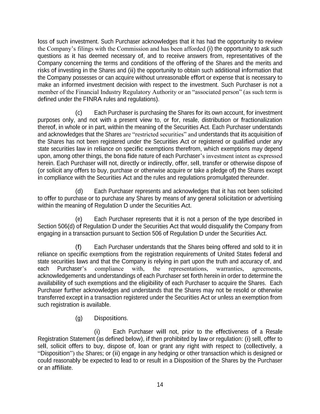 14 loss of such investment. Such Purchaser acknowledges that it has had the opportunity to review the Company’s filings with the Commission and has been afforded (i) the opportunity to ask such questions as it has deemed necessary of, and to receive answers from, representatives of the Company concerning the terms and conditions of the offering of the Shares and the merits and risks of investing in the Shares and (ii) the opportunity to obtain such additional information that the Company possesses or can acquire without unreasonable effort or expense that is necessary to make an informed investment decision with respect to the investment. Such Purchaser is not a member of the Financial Industry Regulatory Authority or an “associated person” (as such term is defined under the FINRA rules and regulations). (c) Each Purchaser is purchasing the Shares for its own account, for investment purposes only, and not with a present view to, or for, resale, distribution or fractionalization thereof, in whole or in part, within the meaning of the Securities Act. Each Purchaser understands and acknowledges that the Shares are “restricted securities” and understands that its acquisition of the Shares has not been registered under the Securities Act or registered or qualified under any state securities law in reliance on specific exemptions therefrom, which exemptions may depend upon, among other things, the bona fide nature of each Purchaser’s investment intent as expressed herein. Each Purchaser will not, directly or indirectly, offer, sell, transfer or otherwise dispose of (or solicit any offers to buy, purchase or otherwise acquire or take a pledge of) the Shares except in compliance with the Securities Act and the rules and regulations promulgated thereunder. (d) Each Purchaser represents and acknowledges that it has not been solicited to offer to purchase or to purchase any Shares by means of any general solicitation or advertising within the meaning of Regulation D under the Securities Act. (e) Each Purchaser represents that it is not a person of the type described in Section 506(d) of Regulation D under the Securities Act that would disqualify the Company from engaging in a transaction pursuant to Section 506 of Regulation D under the Securities Act. (f) Each Purchaser understands that the Shares being offered and sold to it in reliance on specific exemptions from the registration requirements of United States federal and state securities laws and that the Company is relying in part upon the truth and accuracy of, and each Purchaser’s compliance with, the representations, warranties, agreements, acknowledgements and understandings of each Purchaser set forth herein in order to determine the availability of such exemptions and the eligibility of each Purchaser to acquire the Shares. Each Purchaser further acknowledges and understands that the Shares may not be resold or otherwise transferred except in a transaction registered under the Securities Act or unless an exemption from such registration is available. (g) Dispositions. (i) Each Purchaser will not, prior to the effectiveness of a Resale Registration Statement (as defined below), if then prohibited by law or regulation: (i) sell, offer to sell, solicit offers to buy, dispose of, loan or grant any right with respect to (collectively, a “Disposition”) the Shares; or (ii) engage in any hedging or other transaction which is designed or could reasonably be expected to lead to or result in a Disposition of the Shares by the Purchaser or an affiliate.