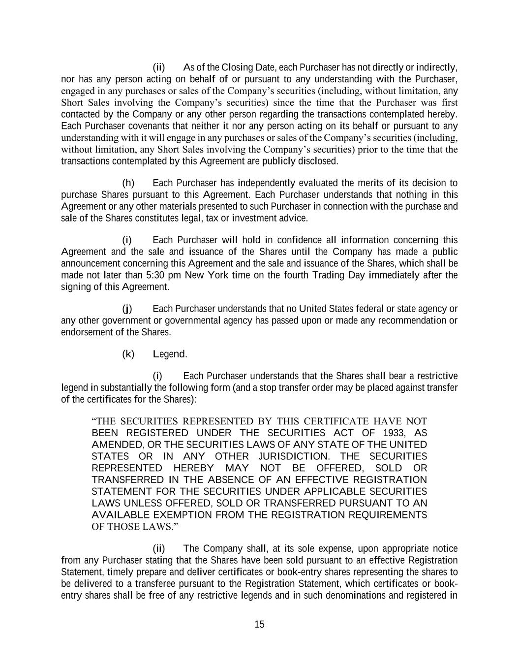 15 (ii) As of the Closing Date, each Purchaser has not directly or indirectly, nor has any person acting on behalf of or pursuant to any understanding with the Purchaser, engaged in any purchases or sales of the Company’s securities (including, without limitation, any Short Sales involving the Company’s securities) since the time that the Purchaser was first contacted by the Company or any other person regarding the transactions contemplated hereby. Each Purchaser covenants that neither it nor any person acting on its behalf or pursuant to any understanding with it will engage in any purchases or sales of the Company’s securities (including, without limitation, any Short Sales involving the Company’s securities) prior to the time that the transactions contemplated by this Agreement are publicly disclosed. (h) Each Purchaser has independently evaluated the merits of its decision to purchase Shares pursuant to this Agreement. Each Purchaser understands that nothing in this Agreement or any other materials presented to such Purchaser in connection with the purchase and sale of the Shares constitutes legal, tax or investment advice. (i) Each Purchaser will hold in confidence all information concerning this Agreement and the sale and issuance of the Shares until the Company has made a public announcement concerning this Agreement and the sale and issuance of the Shares, which shall be made not later than 5:30 pm New York time on the fourth Trading Day immediately after the signing of this Agreement. (j) Each Purchaser understands that no United States federal or state agency or any other government or governmental agency has passed upon or made any recommendation or endorsement of the Shares. (k) Legend. (i) Each Purchaser understands that the Shares shall bear a restrictive legend in substantially the following form (and a stop transfer order may be placed against transfer of the certificates for the Shares): “THE SECURITIES REPRESENTED BY THIS CERTIFICATE HAVE NOT BEEN REGISTERED UNDER THE SECURITIES ACT OF 1933, AS AMENDED, OR THE SECURITIES LAWS OF ANY STATE OF THE UNITED STATES OR IN ANY OTHER JURISDICTION. THE SECURITIES REPRESENTED HEREBY MAY NOT BE OFFERED, SOLD OR TRANSFERRED IN THE ABSENCE OF AN EFFECTIVE REGISTRATION STATEMENT FOR THE SECURITIES UNDER APPLICABLE SECURITIES LAWS UNLESS OFFERED, SOLD OR TRANSFERRED PURSUANT TO AN AVAILABLE EXEMPTION FROM THE REGISTRATION REQUIREMENTS OF THOSE LAWS.” (ii) The Company shall, at its sole expense, upon appropriate notice from any Purchaser stating that the Shares have been sold pursuant to an effective Registration Statement, timely prepare and deliver certificates or book-entry shares representing the shares to be delivered to a transferee pursuant to the Registration Statement, which certificates or book- entry shares shall be free of any restrictive legends and in such denominations and registered in