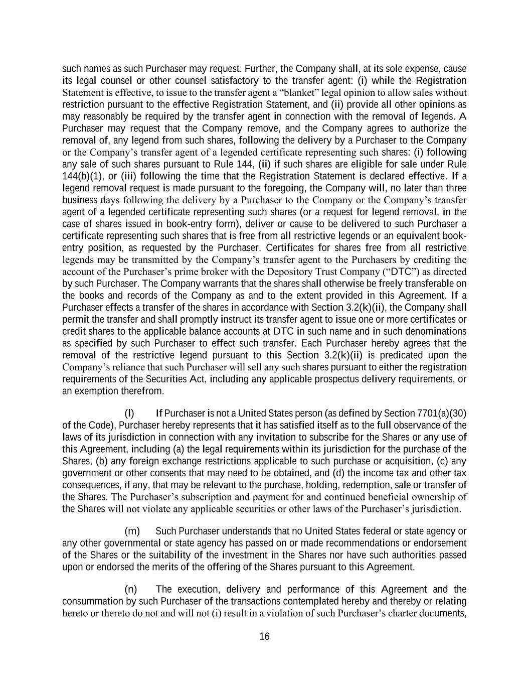 16 such names as such Purchaser may request. Further, the Company shall, at its sole expense, cause its legal counsel or other counsel satisfactory to the transfer agent: (i) while the Registration Statement is effective, to issue to the transfer agent a “blanket” legal opinion to allow sales without restriction pursuant to the effective Registration Statement, and (ii) provide all other opinions as may reasonably be required by the transfer agent in connection with the removal of legends. A Purchaser may request that the Company remove, and the Company agrees to authorize the removal of, any legend from such shares, following the delivery by a Purchaser to the Company or the Company’s transfer agent of a legended certificate representing such shares: (i) following any sale of such shares pursuant to Rule 144, (ii) if such shares are eligible for sale under Rule 144(b)(1), or (iii) following the time that the Registration Statement is declared effective. If a legend removal request is made pursuant to the foregoing, the Company will, no later than three business days following the delivery by a Purchaser to the Company or the Company’s transfer agent of a legended certificate representing such shares (or a request for legend removal, in the case of shares issued in book-entry form), deliver or cause to be delivered to such Purchaser a certificate representing such shares that is free from all restrictive legends or an equivalent book- entry position, as requested by the Purchaser. Certificates for shares free from all restrictive legends may be transmitted by the Company’s transfer agent to the Purchasers by crediting the account of the Purchaser’s prime broker with the Depository Trust Company (“DTC”) as directed by such Purchaser. The Company warrants that the shares shall otherwise be freely transferable on the books and records of the Company as and to the extent provided in this Agreement. If a Purchaser effects a transfer of the shares in accordance with Section 3.2(k)(ii), the Company shall permit the transfer and shall promptly instruct its transfer agent to issue one or more certificates or credit shares to the applicable balance accounts at DTC in such name and in such denominations as specified by such Purchaser to effect such transfer. Each Purchaser hereby agrees that the removal of the restrictive legend pursuant to this Section 3.2(k)(ii) is predicated upon the Company’s reliance that such Purchaser will sell any such shares pursuant to either the registration requirements of the Securities Act, including any applicable prospectus delivery requirements, or an exemption therefrom. (l) If Purchaser is not a United States person (as defined by Section 7701(a)(30) of the Code), Purchaser hereby represents that it has satisfied itself as to the full observance of the laws of its jurisdiction in connection with any invitation to subscribe for the Shares or any use of this Agreement, including (a) the legal requirements within its jurisdiction for the purchase of the Shares, (b) any foreign exchange restrictions applicable to such purchase or acquisition, (c) any government or other consents that may need to be obtained, and (d) the income tax and other tax consequences, if any, that may be relevant to the purchase, holding, redemption, sale or transfer of the Shares. The Purchaser’s subscription and payment for and continued beneficial ownership of the Shares will not violate any applicable securities or other laws of the Purchaser’s jurisdiction. (m) Such Purchaser understands that no United States federal or state agency or any other governmental or state agency has passed on or made recommendations or endorsement of the Shares or the suitability of the investment in the Shares nor have such authorities passed upon or endorsed the merits of the offering of the Shares pursuant to this Agreement. (n) The execution, delivery and performance of this Agreement and the consummation by such Purchaser of the transactions contemplated hereby and thereby or relating hereto or thereto do not and will not (i) result in a violation of such Purchaser’s charter documents,