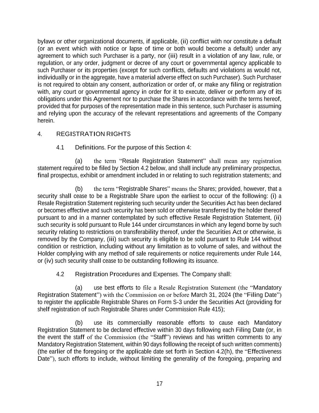 17 bylaws or other organizational documents, if applicable, (ii) conflict with nor constitute a default (or an event which with notice or lapse of time or both would become a default) under any agreement to which such Purchaser is a party, nor (iii) result in a violation of any law, rule, or regulation, or any order, judgment or decree of any court or governmental agency applicable to such Purchaser or its properties (except for such conflicts, defaults and violations as would not, individually or in the aggregate, have a material adverse effect on such Purchaser). Such Purchaser is not required to obtain any consent, authorization or order of, or make any filing or registration with, any court or governmental agency in order for it to execute, deliver or perform any of its obligations under this Agreement nor to purchase the Shares in accordance with the terms hereof, provided that for purposes of the representation made in this sentence, such Purchaser is assuming and relying upon the accuracy of the relevant representations and agreements of the Company herein. 4. REGISTRATION RIGHTS 4.1 Definitions. For the purpose of this Section 4: (a) the term “Resale Registration Statement” shall mean any registration statement required to be filed by Section 4.2 below, and shall include any preliminary prospectus, final prospectus, exhibit or amendment included in or relating to such registration statements; and (b) the term “Registrable Shares” means the Shares; provided, however, that a security shall cease to be a Registrable Share upon the earliest to occur of the following: (i) a Resale Registration Statement registering such security under the Securities Act has been declared or becomes effective and such security has been sold or otherwise transferred by the holder thereof pursuant to and in a manner contemplated by such effective Resale Registration Statement, (ii) such security is sold pursuant to Rule 144 under circumstances in which any legend borne by such security relating to restrictions on transferability thereof, under the Securities Act or otherwise, is removed by the Company, (iii) such security is eligible to be sold pursuant to Rule 144 without condition or restriction, including without any limitation as to volume of sales, and without the Holder complying with any method of sale requirements or notice requirements under Rule 144, or (iv) such security shall cease to be outstanding following its issuance. 4.2 Registration Procedures and Expenses. The Company shall: (a) use best efforts to file a Resale Registration Statement (the “Mandatory Registration Statement”) with the Commission on or before March 31, 2024 (the “Filing Date”) to register the applicable Registrable Shares on Form S-3 under the Securities Act (providing for shelf registration of such Registrable Shares under Commission Rule 415); (b) use its commercially reasonable efforts to cause each Mandatory Registration Statement to be declared effective within 30 days following each Filing Date (or, in the event the staff of the Commission (the “Staff”) reviews and has written comments to any Mandatory Registration Statement, within 90 days following the receipt of such written comments) (the earlier of the foregoing or the applicable date set forth in Section 4.2(h), the “Effectiveness Date”), such efforts to include, without limiting the generality of the foregoing, preparing and