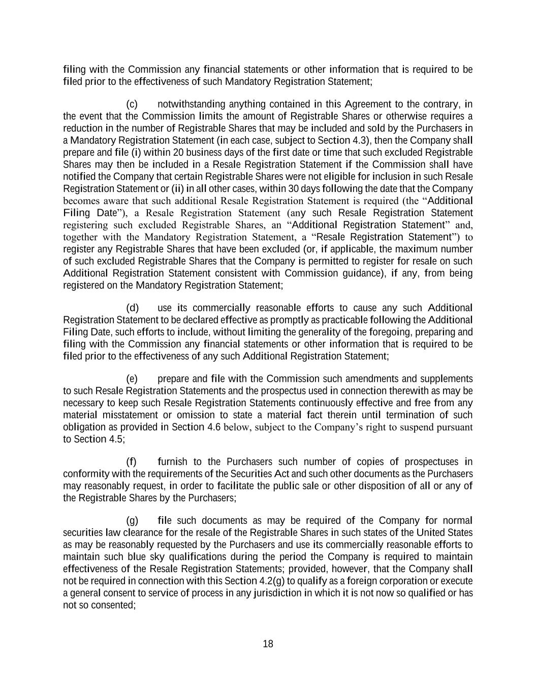 18 filing with the Commission any financial statements or other information that is required to be filed prior to the effectiveness of such Mandatory Registration Statement; (c) notwithstanding anything contained in this Agreement to the contrary, in the event that the Commission limits the amount of Registrable Shares or otherwise requires a reduction in the number of Registrable Shares that may be included and sold by the Purchasers in a Mandatory Registration Statement (in each case, subject to Section 4.3), then the Company shall prepare and file (i) within 20 business days of the first date or time that such excluded Registrable Shares may then be included in a Resale Registration Statement if the Commission shall have notified the Company that certain Registrable Shares were not eligible for inclusion in such Resale Registration Statement or (ii) in all other cases, within 30 days following the date that the Company becomes aware that such additional Resale Registration Statement is required (the “Additional Filing Date”), a Resale Registration Statement (any such Resale Registration Statement registering such excluded Registrable Shares, an “Additional Registration Statement” and, together with the Mandatory Registration Statement, a “Resale Registration Statement”) to register any Registrable Shares that have been excluded (or, if applicable, the maximum number of such excluded Registrable Shares that the Company is permitted to register for resale on such Additional Registration Statement consistent with Commission guidance), if any, from being registered on the Mandatory Registration Statement; (d) use its commercially reasonable efforts to cause any such Additional Registration Statement to be declared effective as promptly as practicable following the Additional Filing Date, such efforts to include, without limiting the generality of the foregoing, preparing and filing with the Commission any financial statements or other information that is required to be filed prior to the effectiveness of any such Additional Registration Statement; (e) prepare and file with the Commission such amendments and supplements to such Resale Registration Statements and the prospectus used in connection therewith as may be necessary to keep such Resale Registration Statements continuously effective and free from any material misstatement or omission to state a material fact therein until termination of such obligation as provided in Section 4.6 below, subject to the Company’s right to suspend pursuant to Section 4.5; (f) furnish to the Purchasers such number of copies of prospectuses in conformity with the requirements of the Securities Act and such other documents as the Purchasers may reasonably request, in order to facilitate the public sale or other disposition of all or any of the Registrable Shares by the Purchasers; (g) file such documents as may be required of the Company for normal securities law clearance for the resale of the Registrable Shares in such states of the United States as may be reasonably requested by the Purchasers and use its commercially reasonable efforts to maintain such blue sky qualifications during the period the Company is required to maintain effectiveness of the Resale Registration Statements; provided, however, that the Company shall not be required in connection with this Section 4.2(g) to qualify as a foreign corporation or execute a general consent to service of process in any jurisdiction in which it is not now so qualified or has not so consented;