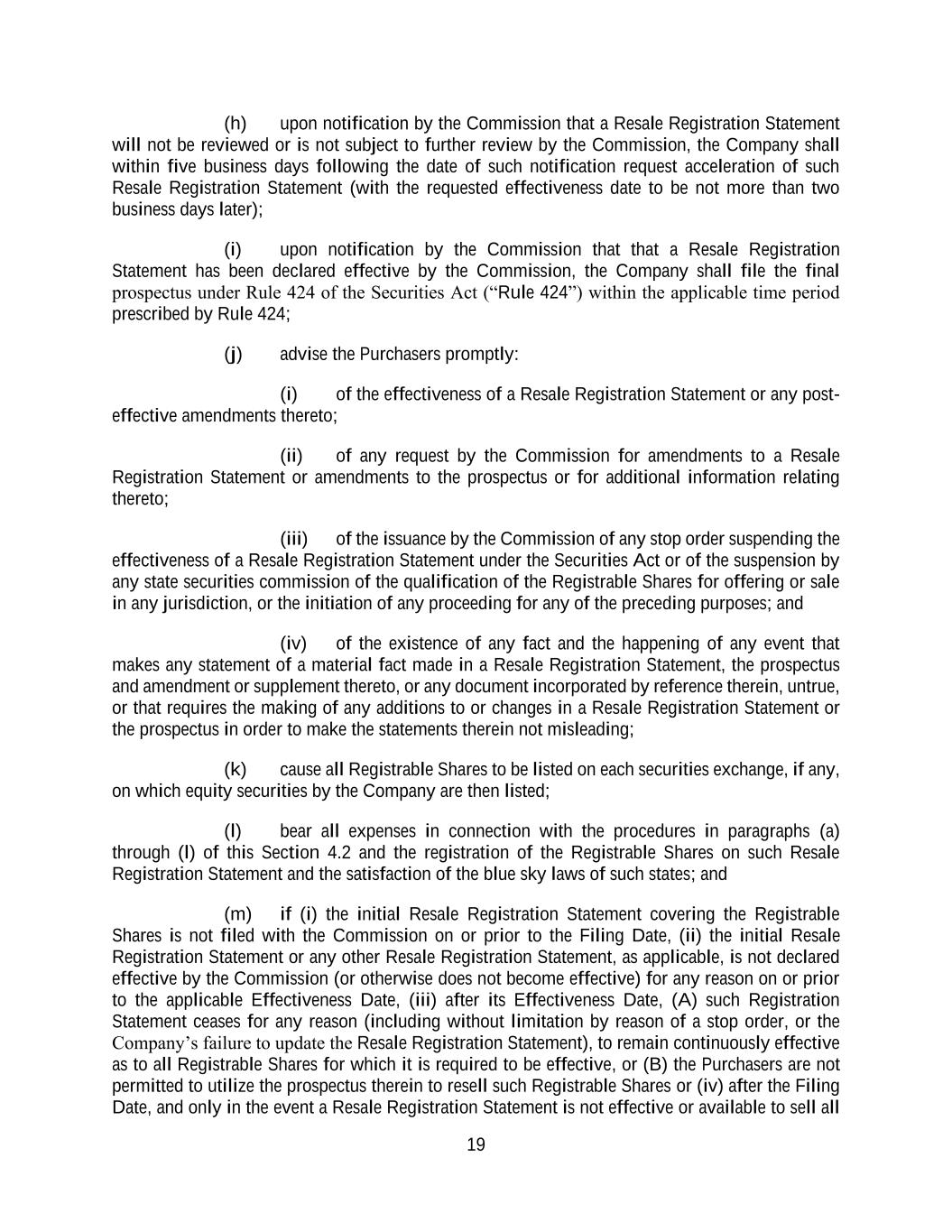 19 (h) upon notification by the Commission that a Resale Registration Statement will not be reviewed or is not subject to further review by the Commission, the Company shall within five business days following the date of such notification request acceleration of such Resale Registration Statement (with the requested effectiveness date to be not more than two business days later); (i) upon notification by the Commission that that a Resale Registration Statement has been declared effective by the Commission, the Company shall file the final prospectus under Rule 424 of the Securities Act (“Rule 424”) within the applicable time period prescribed by Rule 424; (j) advise the Purchasers promptly: (i) of the effectiveness of a Resale Registration Statement or any post- effective amendments thereto; (ii) of any request by the Commission for amendments to a Resale Registration Statement or amendments to the prospectus or for additional information relating thereto; (iii) of the issuance by the Commission of any stop order suspending the effectiveness of a Resale Registration Statement under the Securities Act or of the suspension by any state securities commission of the qualification of the Registrable Shares for offering or sale in any jurisdiction, or the initiation of any proceeding for any of the preceding purposes; and (iv) of the existence of any fact and the happening of any event that makes any statement of a material fact made in a Resale Registration Statement, the prospectus and amendment or supplement thereto, or any document incorporated by reference therein, untrue, or that requires the making of any additions to or changes in a Resale Registration Statement or the prospectus in order to make the statements therein not misleading; (k) cause all Registrable Shares to be listed on each securities exchange, if any, on which equity securities by the Company are then listed; (l) bear all expenses in connection with the procedures in paragraphs (a) through (l) of this Section 4.2 and the registration of the Registrable Shares on such Resale Registration Statement and the satisfaction of the blue sky laws of such states; and (m) if (i) the initial Resale Registration Statement covering the Registrable Shares is not filed with the Commission on or prior to the Filing Date, (ii) the initial Resale Registration Statement or any other Resale Registration Statement, as applicable, is not declared effective by the Commission (or otherwise does not become effective) for any reason on or prior to the applicable Effectiveness Date, (iii) after its Effectiveness Date, (A) such Registration Statement ceases for any reason (including without limitation by reason of a stop order, or the Company’s failure to update the Resale Registration Statement), to remain continuously effective as to all Registrable Shares for which it is required to be effective, or (B) the Purchasers are not permitted to utilize the prospectus therein to resell such Registrable Shares or (iv) after the Filing Date, and only in the event a Resale Registration Statement is not effective or available to sell all