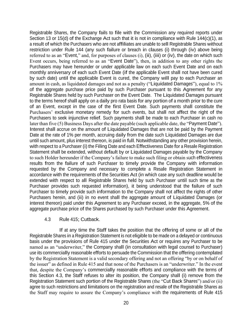 20 Registrable Shares, the Company fails to file with the Commission any required reports under Section 13 or 15(d) of the Exchange Act such that it is not in compliance with Rule 144(c)(1), as a result of which the Purchasers who are not affiliates are unable to sell Registrable Shares without restriction under Rule 144 (any such failure or breach in clauses (i) through (iv) above being referred to as an “Event,” and, for purposes of clauses (i), (ii), (iii) or (iv), the date on which such Event occurs, being referred to as an “Event Date”), then, in addition to any other rights the Purchasers may have hereunder or under applicable law on each such Event Date and on each monthly anniversary of each such Event Date (if the applicable Event shall not have been cured by such date) until the applicable Event is cured, the Company will pay to each Purchaser an amount in cash, as liquidated damages and not as a penalty (“Liquidated Damages”), equal to 1% of the aggregate purchase price paid by such Purchaser pursuant to this Agreement for any Registrable Shares held by such Purchaser on the Event Date. The Liquidated Damages pursuant to the terms hereof shall apply on a daily pro rata basis for any portion of a month prior to the cure of an Event, except in the case of the first Event Date. Such payments shall constitute the Purchasers’ exclusive monetary remedy for such events, but shall not affect the right of the Purchasers to seek injunctive relief. Such payments shall be made to each Purchaser in cash no later than five (5) Business Days after the date payable (such applicable date, the “Payment Date”). Interest shall accrue on the amount of Liquidated Damages that are not be paid by the Payment Date at the rate of 1% per month, accruing daily from the date such Liquidated Damages are due until such amount, plus interest thereon, is paid in full. Notwithstanding any other provision herein, with respect to a Purchaser (i) the Filing Date and each Effectiveness Date for a Resale Registration Statement shall be extended, without default by or Liquidated Damages payable by the Company to such Holder hereunder if the Company’s failure to make such filing or obtain such effectiveness results from the failure of such Purchaser to timely provide the Company with information requested by the Company and necessary to complete a Resale Registration Statement in accordance with the requirements of the Securities Act (in which case any such deadline would be extended with respect to all Registrable Shares held by such Purchaser until such time as the Purchaser provides such requested information), it being understood that the failure of such Purchaser to timely provide such information to the Company shall not affect the rights of other Purchasers herein, and (ii) in no event shall the aggregate amount of Liquidated Damages (or interest thereon) paid under this Agreement to any Purchaser exceed, in the aggregate, 5% of the aggregate purchase price of the Shares purchased by such Purchaser under this Agreement. 4.3 Rule 415; Cutback. If at any time the Staff takes the position that the offering of some or all of the Registrable Shares in a Registration Statement is not eligible to be made on a delayed or continuous basis under the provisions of Rule 415 under the Securities Act or requires any Purchaser to be named as an “underwriter,” the Company shall (in consultation with legal counsel to Purchaser) use its commercially reasonable efforts to persuade the Commission that the offering contemplated by the Registration Statement is a valid secondary offering and not an offering “by or on behalf of the issuer” as defined in Rule 415 and that none of the Purchasers is an “underwriter.” In the event that, despite the Company’s commercially reasonable efforts and compliance with the terms of this Section 4.3, the Staff refuses to alter its position, the Company shall (i) remove from the Registration Statement such portion of the Registrable Shares (the “Cut Back Shares”) and/or (ii) agree to such restrictions and limitations on the registration and resale of the Registrable Shares as the Staff may require to assure the Company’s compliance with the requirements of Rule 415