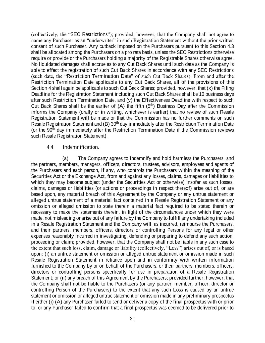 21 (collectively, the “SEC Restrictions”); provided, however, that the Company shall not agree to name any Purchaser as an “underwriter” in such Registration Statement without the prior written consent of such Purchaser. Any cutback imposed on the Purchasers pursuant to this Section 4.3 shall be allocated among the Purchasers on a pro rata basis, unless the SEC Restrictions otherwise require or provide or the Purchasers holding a majority of the Registrable Shares otherwise agree. No liquidated damages shall accrue as to any Cut Back Shares until such date as the Company is able to effect the registration of such Cut Back Shares in accordance with any SEC Restrictions (such date, the “Restriction Termination Date” of such Cut Back Shares). From and after the Restriction Termination Date applicable to any Cut Back Shares, all of the provisions of this Section 4 shall again be applicable to such Cut Back Shares; provided, however, that (x) the Filing Deadline for the Registration Statement including such Cut Back Shares shall be 10 business days after such Restriction Termination Date, and (y) the Effectiveness Deadline with respect to such Cut Back Shares shall be the earlier of (A) the fifth (5th) Business Day after the Commission informs the Company (orally or in writing, whichever is earlier) that no review of such Resale Registration Statement will be made or that the Commission has no further comments on such Resale Registration Statement and (B) 30th day immediately after the Restriction Termination Date (or the 90th day immediately after the Restriction Termination Date if the Commission reviews such Resale Registration Statement). 4.4 Indemnification. (a) The Company agrees to indemnify and hold harmless the Purchasers, and the partners, members, managers, officers, directors, trustees, advisors, employees and agents of the Purchasers and each person, if any, who controls the Purchasers within the meaning of the Securities Act or the Exchange Act, from and against any losses, claims, damages or liabilities to which they may become subject (under the Securities Act or otherwise) insofar as such losses, claims, damages or liabilities (or actions or proceedings in respect thereof) arise out of, or are based upon, any material breach of this Agreement by the Company or any untrue statement or alleged untrue statement of a material fact contained in a Resale Registration Statement or any omission or alleged omission to state therein a material fact required to be stated therein or necessary to make the statements therein, in light of the circumstances under which they were made, not misleading or arise out of any failure by the Company to fulfill any undertaking included in a Resale Registration Statement and the Company will, as incurred, reimburse the Purchasers, and their partners, members, officers, directors or controlling Persons for any legal or other expenses reasonably incurred in investigating, defending or preparing to defend any such action, proceeding or claim; provided, however, that the Company shall not be liable in any such case to the extent that such loss, claim, damage or liability (collectively, “Loss”) arises out of, or is based upon: (i) an untrue statement or omission or alleged untrue statement or omission made in such Resale Registration Statement in reliance upon and in conformity with written information furnished to the Company by or on behalf of the Purchasers, or their partners, members, officers, directors or controlling persons specifically for use in preparation of a Resale Registration Statement; or (ii) any breach of this Agreement by the Purchasers; provided further, however, that the Company shall not be liable to the Purchasers (or any partner, member, officer, director or controlling Person of the Purchasers) to the extent that any such Loss is caused by an untrue statement or omission or alleged untrue statement or omission made in any preliminary prospectus if either (i) (A) any Purchaser failed to send or deliver a copy of the final prospectus with or prior to, or any Purchaser failed to confirm that a final prospectus was deemed to be delivered prior to