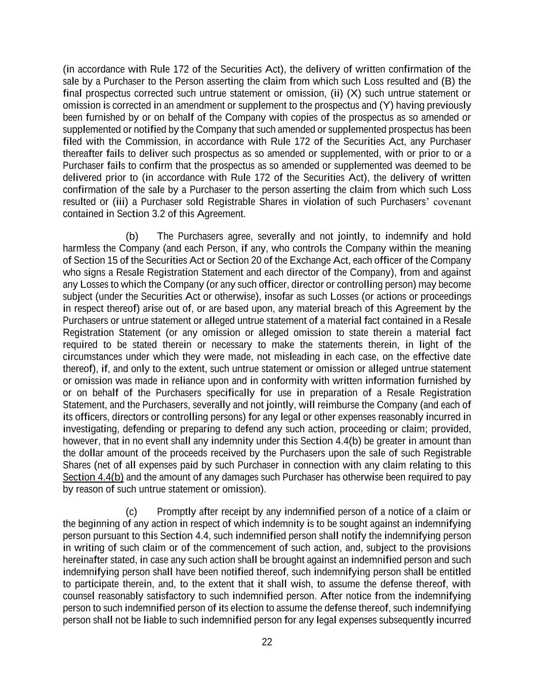 22 (in accordance with Rule 172 of the Securities Act), the delivery of written confirmation of the sale by a Purchaser to the Person asserting the claim from which such Loss resulted and (B) the final prospectus corrected such untrue statement or omission, (ii) (X) such untrue statement or omission is corrected in an amendment or supplement to the prospectus and (Y) having previously been furnished by or on behalf of the Company with copies of the prospectus as so amended or supplemented or notified by the Company that such amended or supplemented prospectus has been filed with the Commission, in accordance with Rule 172 of the Securities Act, any Purchaser thereafter fails to deliver such prospectus as so amended or supplemented, with or prior to or a Purchaser fails to confirm that the prospectus as so amended or supplemented was deemed to be delivered prior to (in accordance with Rule 172 of the Securities Act), the delivery of written confirmation of the sale by a Purchaser to the person asserting the claim from which such Loss resulted or (iii) a Purchaser sold Registrable Shares in violation of such Purchasers’ covenant contained in Section 3.2 of this Agreement. (b) The Purchasers agree, severally and not jointly, to indemnify and hold harmless the Company (and each Person, if any, who controls the Company within the meaning of Section 15 of the Securities Act or Section 20 of the Exchange Act, each officer of the Company who signs a Resale Registration Statement and each director of the Company), from and against any Losses to which the Company (or any such officer, director or controlling person) may become subject (under the Securities Act or otherwise), insofar as such Losses (or actions or proceedings in respect thereof) arise out of, or are based upon, any material breach of this Agreement by the Purchasers or untrue statement or alleged untrue statement of a material fact contained in a Resale Registration Statement (or any omission or alleged omission to state therein a material fact required to be stated therein or necessary to make the statements therein, in light of the circumstances under which they were made, not misleading in each case, on the effective date thereof), if, and only to the extent, such untrue statement or omission or alleged untrue statement or omission was made in reliance upon and in conformity with written information furnished by or on behalf of the Purchasers specifically for use in preparation of a Resale Registration Statement, and the Purchasers, severally and not jointly, will reimburse the Company (and each of its officers, directors or controlling persons) for any legal or other expenses reasonably incurred in investigating, defending or preparing to defend any such action, proceeding or claim; provided, however, that in no event shall any indemnity under this Section 4.4(b) be greater in amount than the dollar amount of the proceeds received by the Purchasers upon the sale of such Registrable Shares (net of all expenses paid by such Purchaser in connection with any claim relating to this Section 4.4(b) and the amount of any damages such Purchaser has otherwise been required to pay by reason of such untrue statement or omission). (c) Promptly after receipt by any indemnified person of a notice of a claim or the beginning of any action in respect of which indemnity is to be sought against an indemnifying person pursuant to this Section 4.4, such indemnified person shall notify the indemnifying person in writing of such claim or of the commencement of such action, and, subject to the provisions hereinafter stated, in case any such action shall be brought against an indemnified person and such indemnifying person shall have been notified thereof, such indemnifying person shall be entitled to participate therein, and, to the extent that it shall wish, to assume the defense thereof, with counsel reasonably satisfactory to such indemnified person. After notice from the indemnifying person to such indemnified person of its election to assume the defense thereof, such indemnifying person shall not be liable to such indemnified person for any legal expenses subsequently incurred